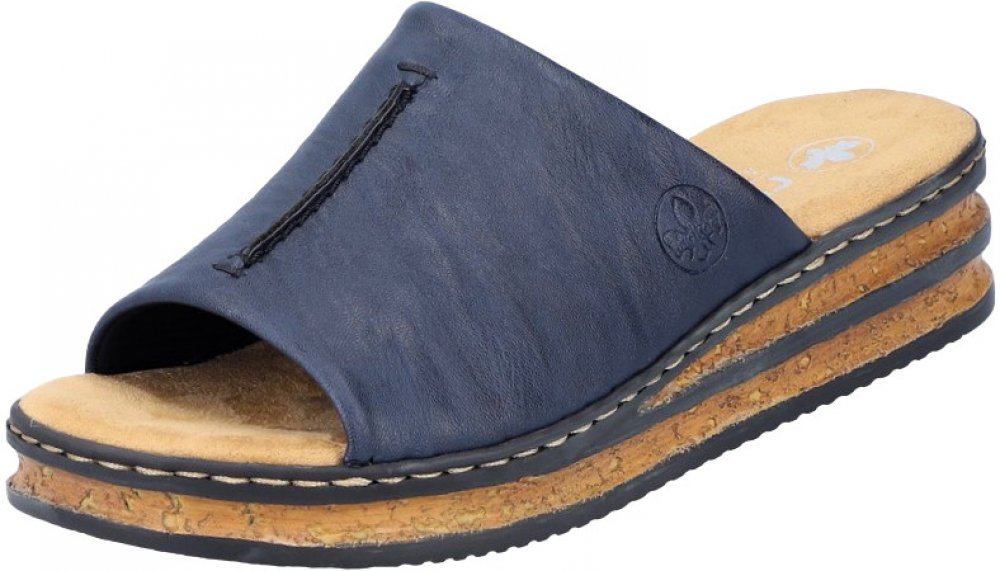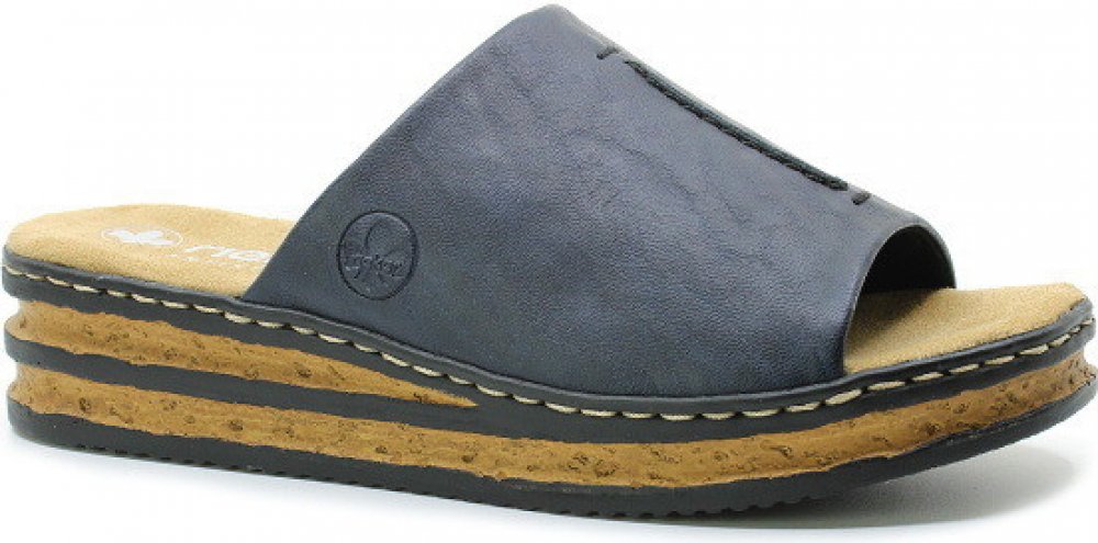 Právě jste našli lety prověřenou klasiku. Tyto dámské letní pantofle jsou jedny z nejprodávanějších od výrobce RIEKER. Přes nárt je širší pásek v tmavě modré barvě. Komfort Vaší chůze bude zajišťovat vyměkčená stélka. Zajímavá, vyšší podešev - platforma. Výška pod patou je cca 4 cm.
