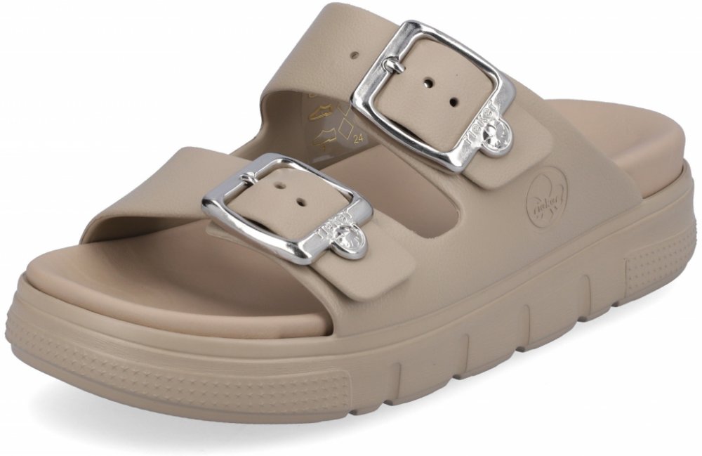 Dámské pantofle značky Rieker na pohodlné platformě. Díky sponě přes nárt jsou pantofle snadno nastavitelné. Vyměkčené stélky si zamilujete. Podešev: Podešev obuvi je s jemným protiskluzovým vzorkem vyrobená ze syntetického materiálu. Na platformě vysoké 5 cm. Svršek: Svršek obuvi je vyrobený ze syntetického materiálu. Barva svršku je béžová. Podšívka: Podšívka je vyrobená ze syntetického materiálu. Stélka: Stélka je vyrobená ze syntetického materiálu. Šířka: G Svršek: syntetika Podšívka: syntetika Stélka: syntetika Podešev: syntetika Šířka: G
