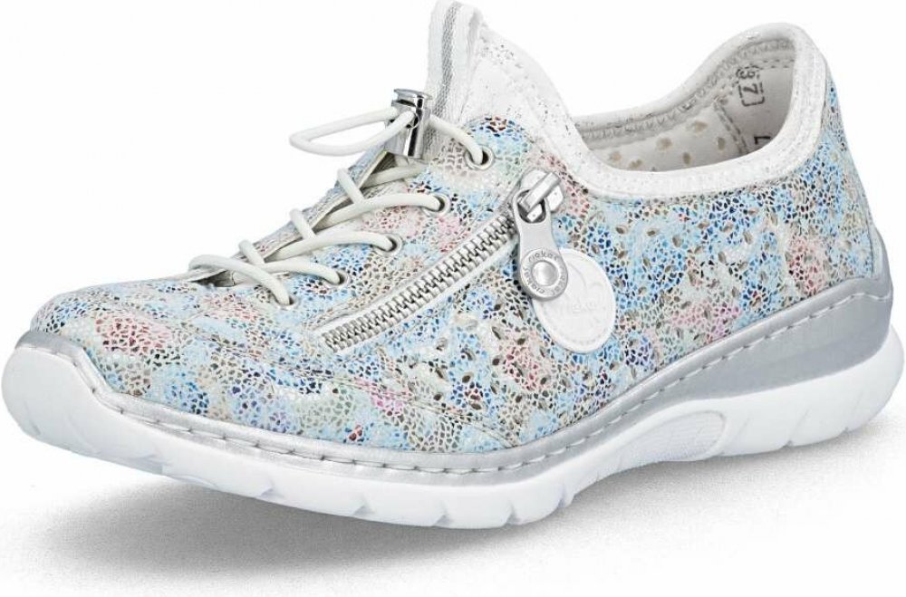Tenisky RIEKER zaujmou na první pohled výraznou barevnou kombinací a perforovaným vzorem, který zajišťuje optimální prodyšnost a komfort i během teplejších dní. Celkový design doplňuje logo značky spolu s dekorativním zipem, který podtrhuje moderní a originální charakter modelu. Pružný lem horního okraje se příjemně přizpůsobí tvaru chodidla, zatímco šněrování gumičkou se stahovacím prvkem slouží jako stylový detail, který dotváří jedinečný vzhled obuvi. Měkká stélka poskytuje příjemný došlap a v kombinaci s flexibilní podešví tlumí nárazy při chůzi, čímž zaručuje maximální pohodlí během celého dne. Tyto tenisky jsou ideální volbou pro ženy, které hledají spojení moderního designu a pohodlí - ať už na aktivní dny ve městě, delší procházky nebo volnočasové aktivity. RIEKER přináší jistotu kroku, styl a komfort v jednom.