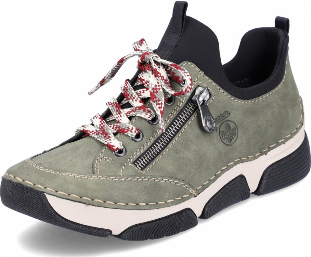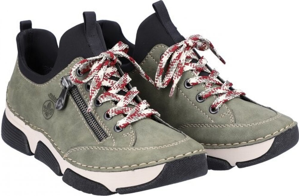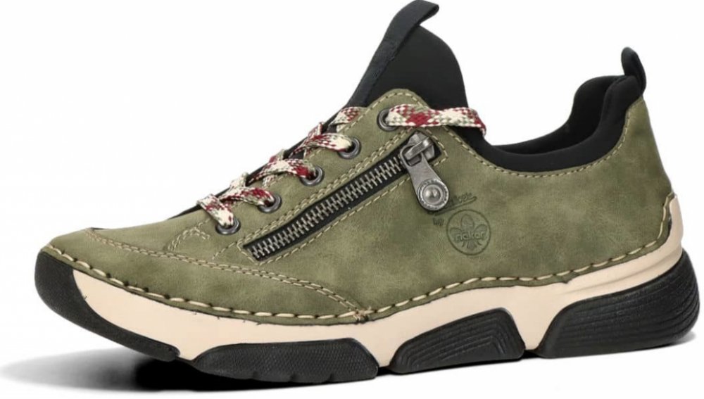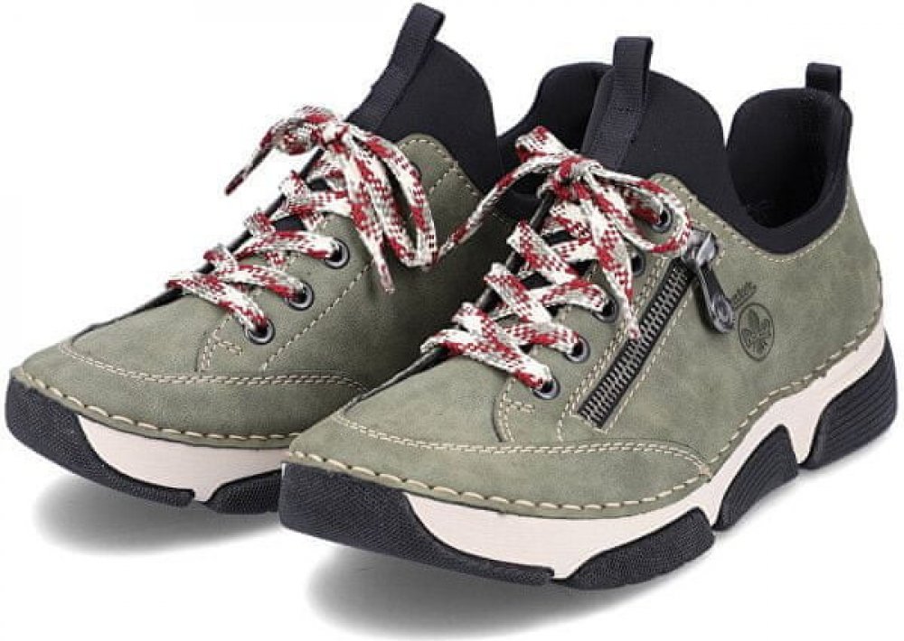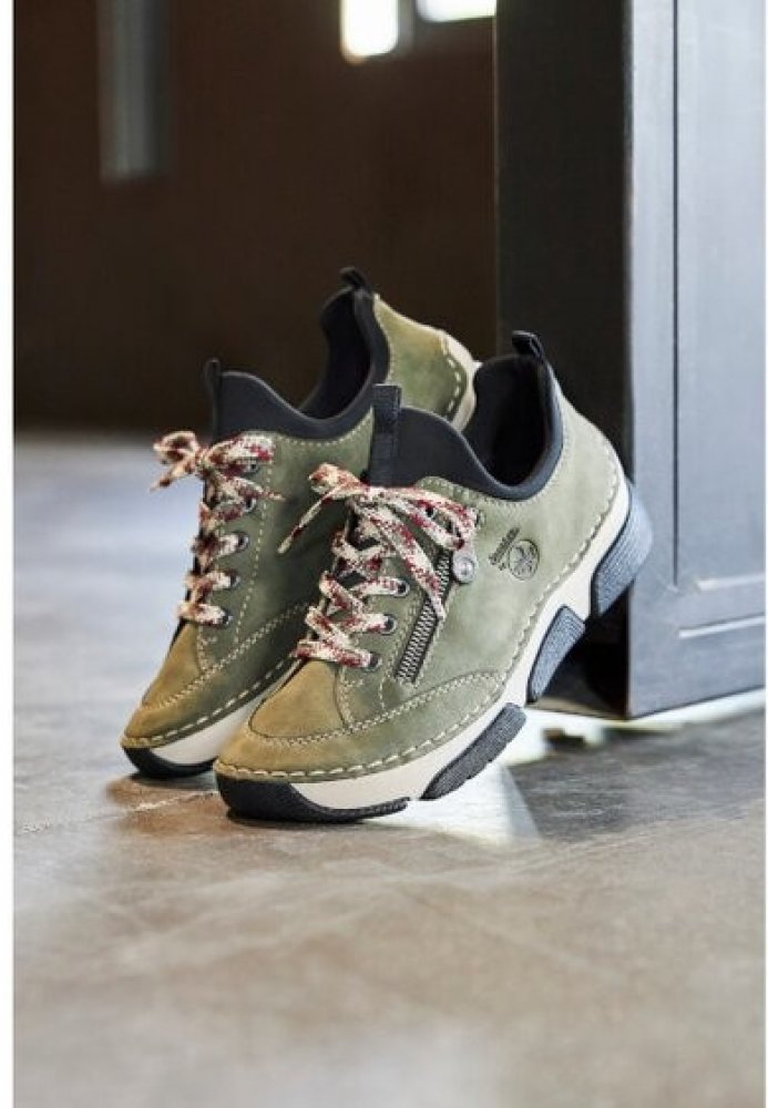Dámské polobotky sportovního typu značky Rieker. Svršek je vyroben v designu broušené kůže v matně zelené barvě. Výrazné šití v béžové barvě koresponduje se světlou částí podešve. Celkově je podešev nepřehlédnutelná. Její tvarová a barevná kombinace je zcela originální a přitom nevtíravá. Stejně tak ploché tkaničky ve stylu KARO. Zip na vnější straně nártu je designový prvek. Podšívka je měkká st...