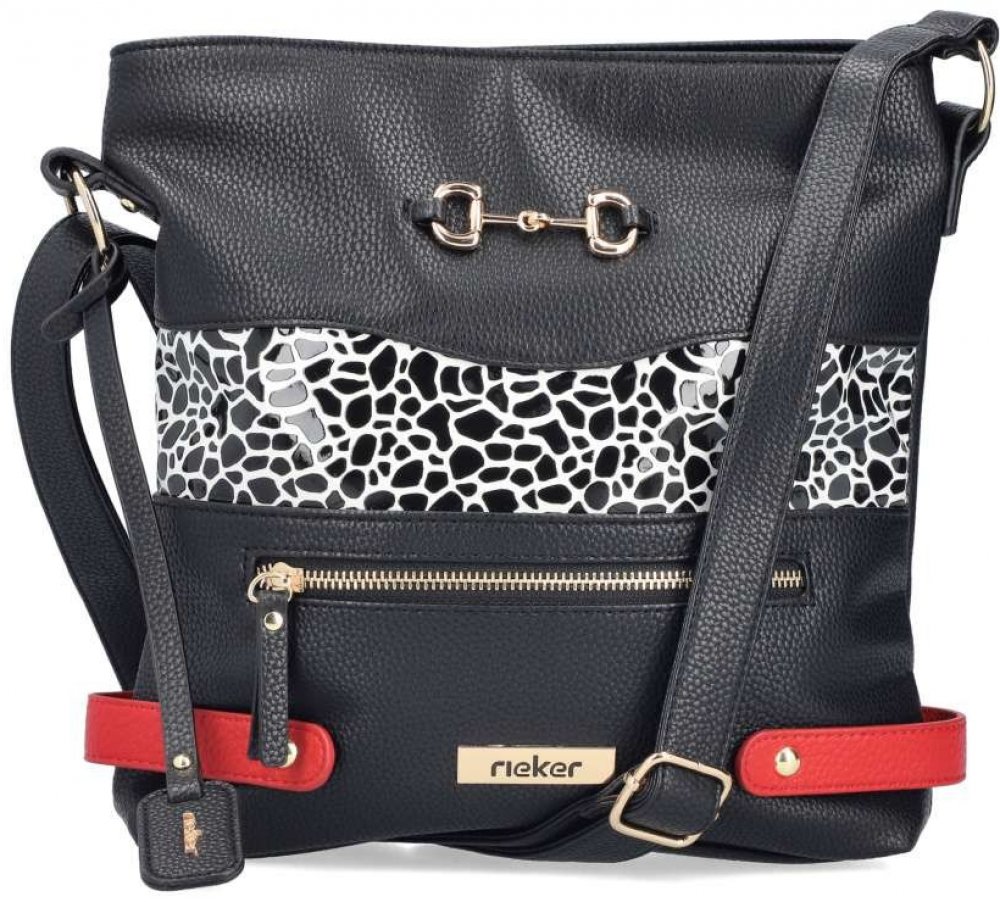 Kabelka RIEKER je skvělou volbou pro ženy, které chtějí spojit výrazný vzhled s každodenní funkčností. Černý svršek zvýrazní moderní vzor doplněný o kontrastní červené detaily a kovové prvky, které vytváří jedinečný a stylový vzhled. Originální tvář kabelky dotváří visačka s logem značky. Promyšlené vnitřní uspořádání v podobě dvou samostatných přihrádek na zip, přední a zadní kapsy poskytuje dostatek prostoru a pomáhá udržet přehled o uložených věcech. Díky nastavitelnému popruhu lze kabelku pohodlně nosit dle potřeby – přes rameno nebo crossbody. Stylové detaily a promyšlené uspořádání vnitřního prostoru z ní dělají ideálního společníka do práce i pro volný čas.