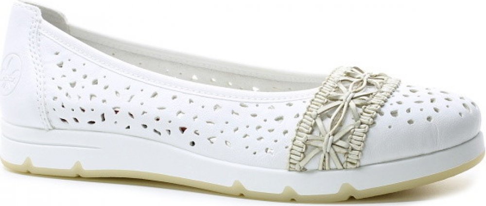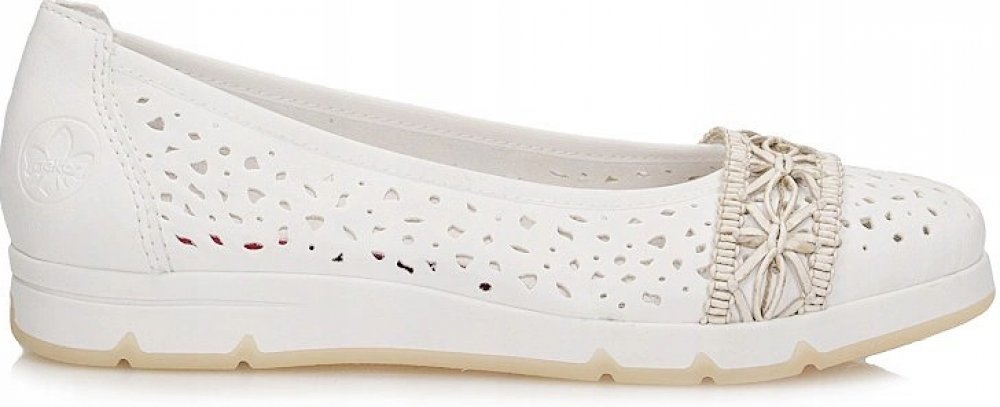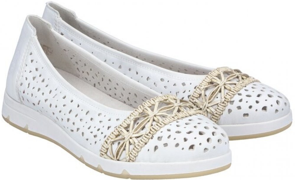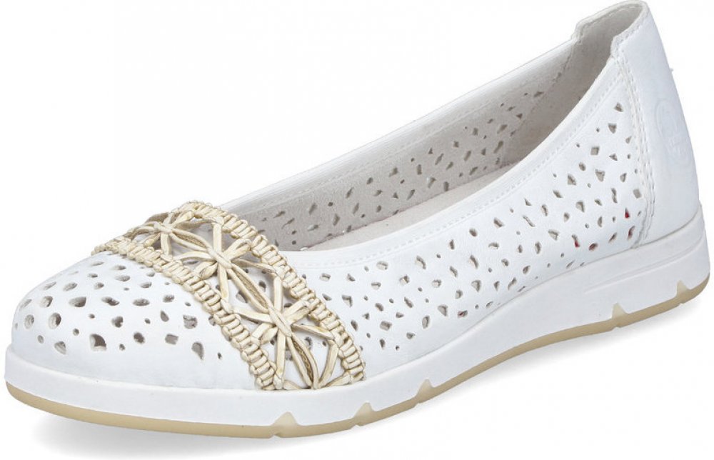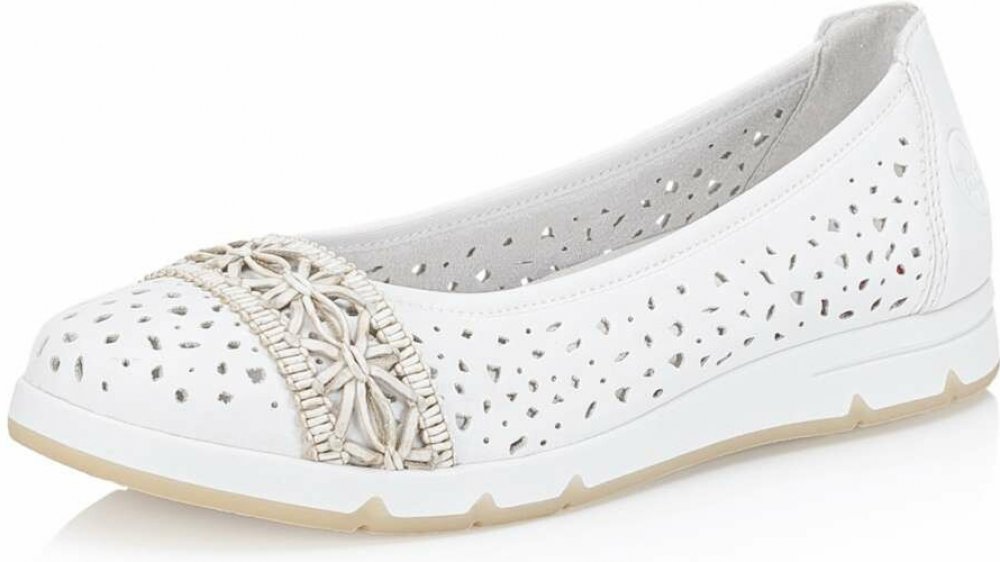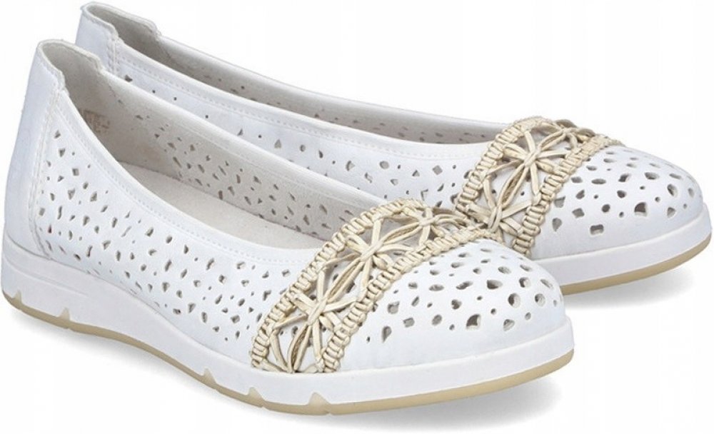 Elegantní a pohodlné baleríny RIEKER se stanou nepostradatelným doplňkem vašeho letního šatníku. Jejich bílý svršek je zdoben jemnou perforací, která nejen zajišťuje optimální prodyšnost, ale také dodává obuvi sofistikovaný vzhled. Přední část balerín je originálně zdobená, čímž podtrhuje jejich jedinečný styl. Měkká vyjímatelná stélka umožňuje individuální přizpůsobení a usnadňuje údržbu, zatímco flexibilní podešev se postará o pohodlný a přirozený pohyb při každém kroku. Díky inovativním technologiím, jako je Antistress a Rieker Soft, tyto baleríny nejen skvěle vypadají, ale zároveň poskytují maximální komfort po celý den. Ideální volba pro ženy, které chtějí spojit styl, lehkost a pohodlí.
