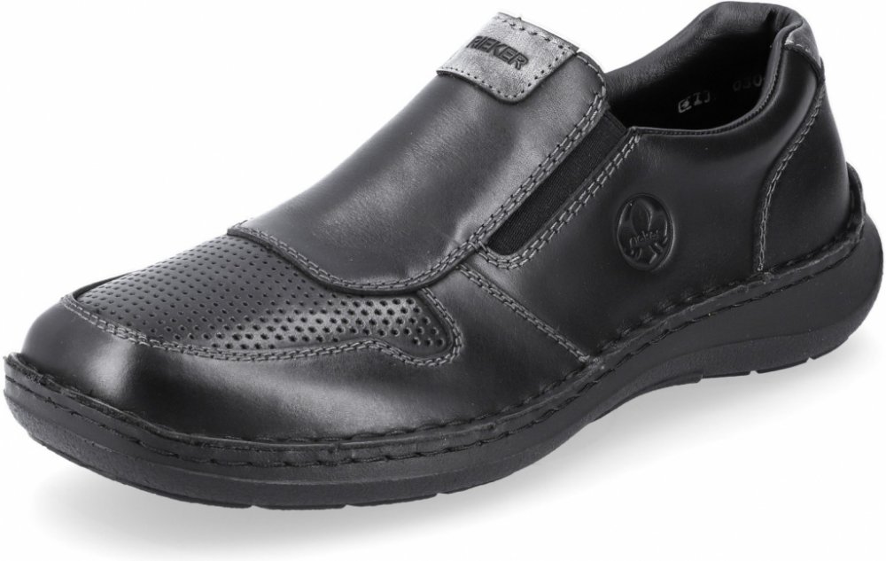 Boty Rieker - flexiblové pánské mokasiny nadměrné šíře s perforovaným svrškem z usně, s podšívkou kombinovanou syntetika/textil a se stélkou z usně jsou na vnitřní i vnější straně nártu vybavené vsazenými gumičkami. Podešev je flexibilní a díky systému Antistress skvěle tlumí nárazy a otřesy. Klínek je vysoký 3,- cm. Flexiblová obuv - prošívaná podešev, obuv používejte v suchém prostředí. Při zvýšené vlhkosti může dojít k promáčení obuvi. Obuv pravidelně impregnujte nebo krémujte, zvláště pak prošívaný okraj. Materiál svršku: Useň. Materiál podšívky: Textil. Materiál podešve: Syntetika. Barva: Grafitové. Sezóna: Celoroční. Tvar: Polobotky. Typ uživatele: Pánské. Typ zapínání: slip on.