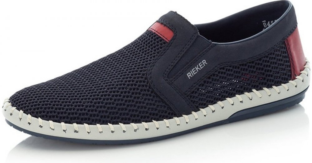 Pánské mokasíny značky RIEKER Vás okouzlí na první pohled. Perforovaný svršek zajistí skvělou prodyšnost obuvi. Stélka vybavená technologií MemoSoft a měkká podešev lemovaná výrazným prošíváním zajistí pohodlí při chůzi.Díky pružným gumičkám po stranách se obuv skvěle přizpůsobí Vaší noze. Tyto botky využijete především během letních dnů na procházkách i na cestě do práce.
