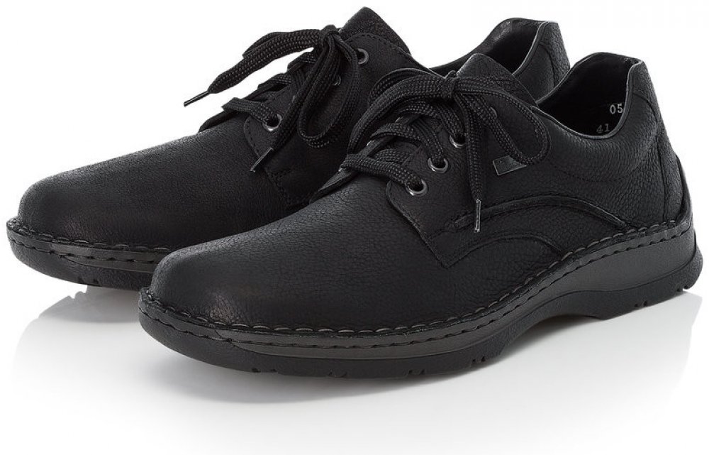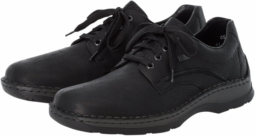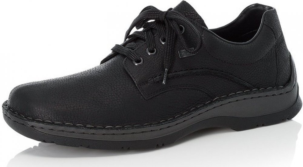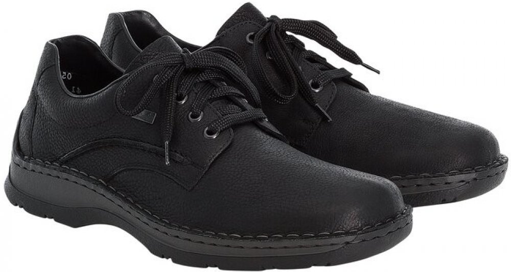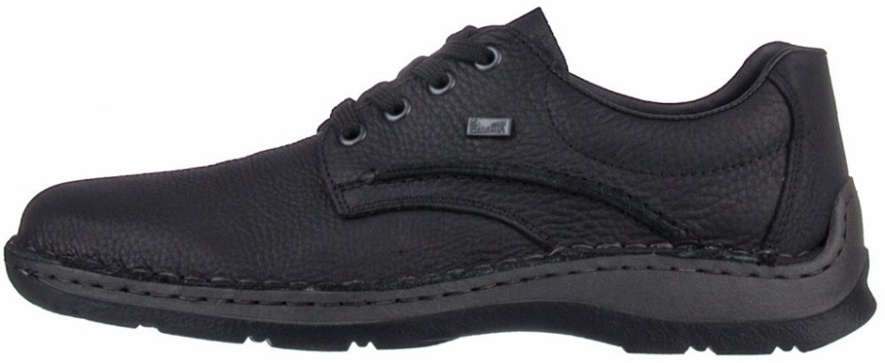 Pánské boty značky Rieker jsou vyrobené z pořádné pravé kůže v černé barvě. Navíc jsou vybaveny Rieker TEX membránou - odpuzuje vodu a zajišťuje v botách ideální klima - je prodyšná. Model nemá v přední části na nártní straně žádné šití - je vyroben z jednoho kusu kůže a navíc je díky kulaté přední části velice prostorný. Je tak pohodlný, netlačí (což je občas problém u bot, které mají v přední části zdobné šití nebo jsou skládané z více dílů) a přizpůsobí se potřebám nohou. Stélka je příjemně vyměkčena. Podešev - ač je robustnější, je vybavena technologií Antistress - tzn., že boty jsou optimálně flexibilní při chůzi a podešev není těžká. Obouvání pomocí klasického šněrování.