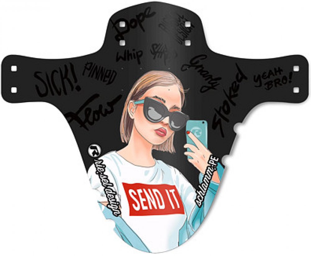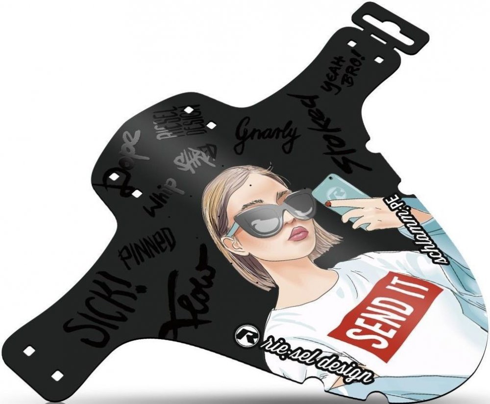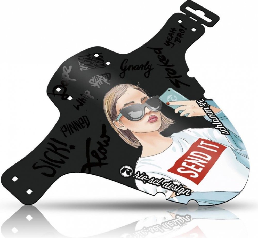 Přední blatník „SchlammPE“ od německé firmy Riesel Design je vyroben z vysoce kvalitního plastu a je navržen pro široké použití na horských kolech s 26" až 29" koly. Blatník se připevňuje připevněný pomocí stahovacích pásků mezi nohama a můstkem vidlice. "SchlammPE" byl navržen jako ochrana proti stříkající vodě, která chrání váš obličej před nečistotami, blátem a vodou za nepříznivých podmínek. Černé stahovací pásky jsou součástí dodávky.