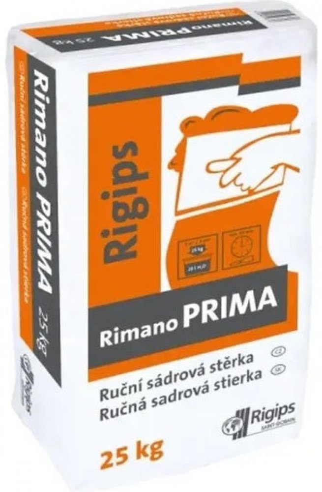 Rigips Rimano Prima vnitřní sádrová omítka je šedá jemná tenkovrstvá sádrová omítka se speciální přilnavostí pro použití v interiéru. Jedná se o hladkou omítku vhodnou pro vyhlazení jádrových omítek, na vyplnění trhlin, děr a rýh, používá se také jako podkladová vrstva pod Rimano Final. Výhody Snadné zpracování Dobrá přilnavost Vhodné jako podklad pod malbu, tapety, lak i disperzní nátěry Materiál je vhodný i na vyplnění trhlin, děr a rýh Spotřeba 2,7 kg/m²/3 mm Mísicí poměr 1,2 kg/1 l vody Příprava podkladu Při použití na betonový podklad doporučujeme použít kontaktní můstek Rikombi Kontakt. Na pórobetonové a všechny savé podklady doporučujeme použít regulátor savosti Rikombi Grund. Doporučená tloušťka nanášení je 3 - 6 mm. Aplikace Přibližně 1,2 kg směsi nasypeme do 1 l vody. Po 5 minutách směs rozmícháme dohladka ručně nebo elektrickým míchadlem. Rimano PRIMA se nanese na připravenou plochu nerezovým nářadím. Povrch se uhladí ve dvou směrech - svisle a vodorovně. V případě potřeby je možné nanášet i ve více vrstvách, systémem mokré do mokrého. Otevřené balení je nutné spotřebovat do 3 měsíců. Dostupné balení: 25 kg