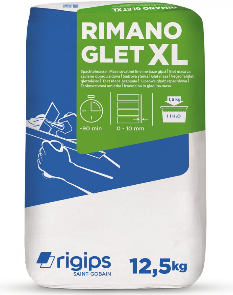 Jemná tenkovrstvá sádrová stěrka s hlazeným povrchem nejvyšší kvality Rimano Glet XL pro povrchovou úpravu stěn a stropů v interiéru.Stěrka je vhodná na beton, pórobeton, suché cementové omítky, sádrové omítky, pro celoplošné tmelení sádrokartonu v kvalitě povrchu Q4 (max. tl. 3 mm) a při renovaci štukových omítek. Především pro ruční (případně strojní – Airless) zpracování.