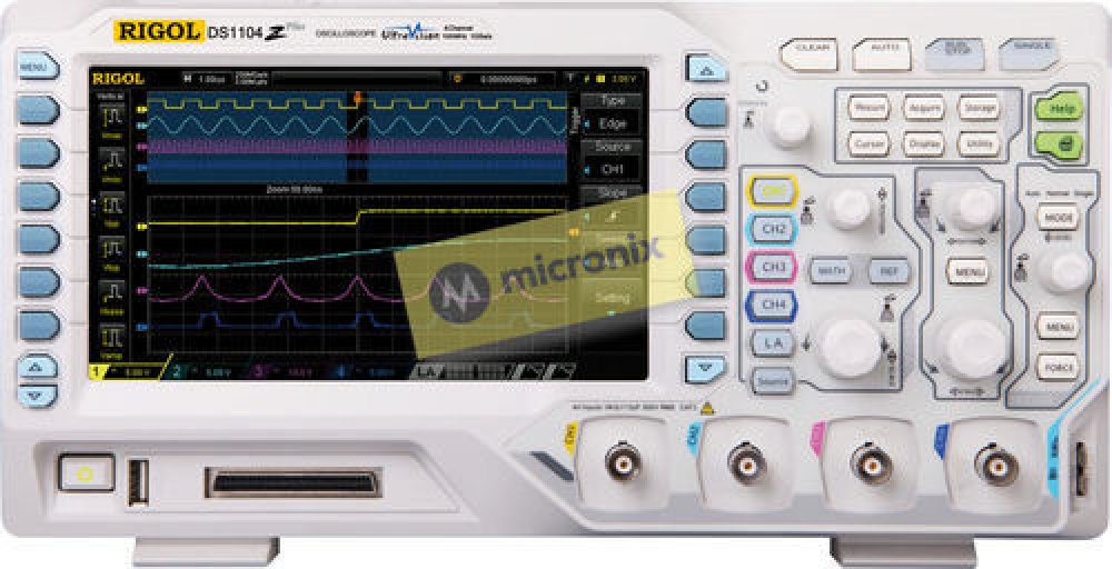 DS1104Z Plus je 4-kanálový osciloskop s šířkou pásma 100 MHz. Nabízí vzorkování v reálném čase až 1 GSa/s. Tato verze je "MSO ready" - má možnost upgradu na MSO (opt.) - možnost používat 16 digitálních kanálů (16-bitová logická analýza). Má barevný TFT displej s úhlopříčkou 178 mm (800 x 480 bodů), hloubku paměti 24M bodů rychlost zachytávání až 30 000 průběhů/s, inovativní technologii "UltraVisio...