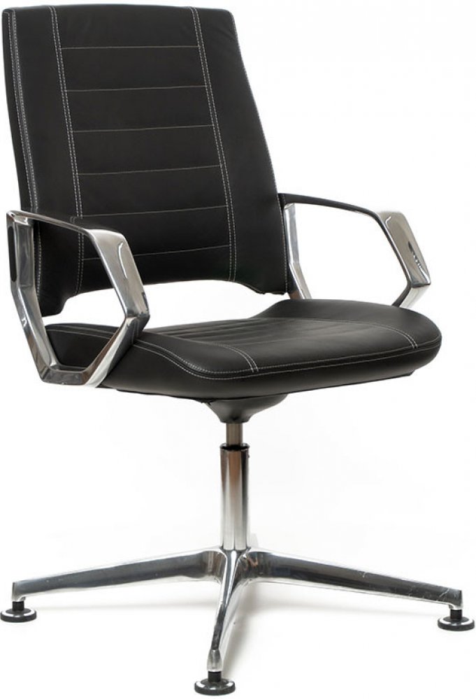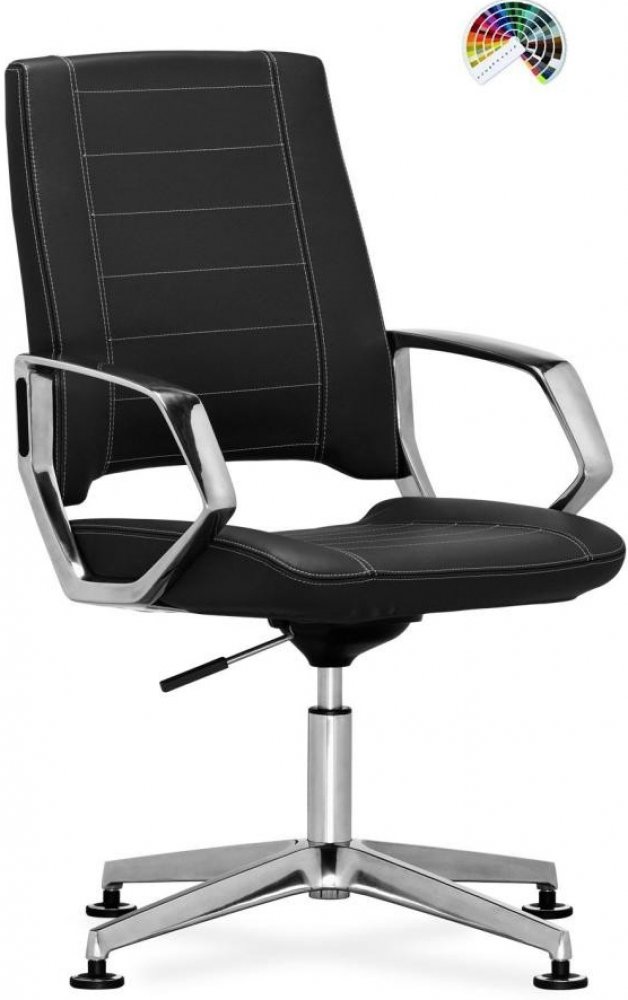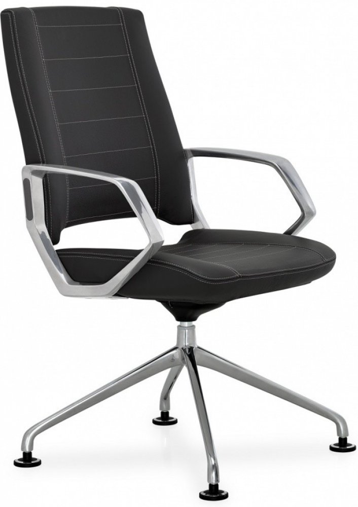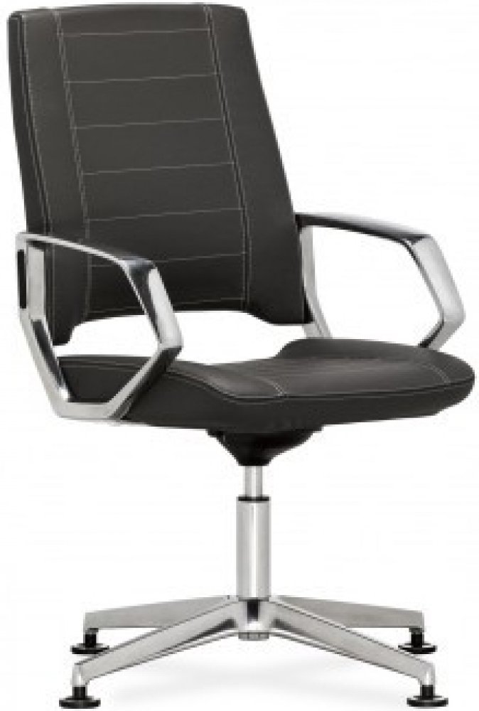 Konferenční židle s nastavitelnou výškou s nízkým opěradlem na čtyřramenném kříži z leštěného hliníku. Pro větší pohodlí může být židle vybavena přídavným houpacím mechanismem.