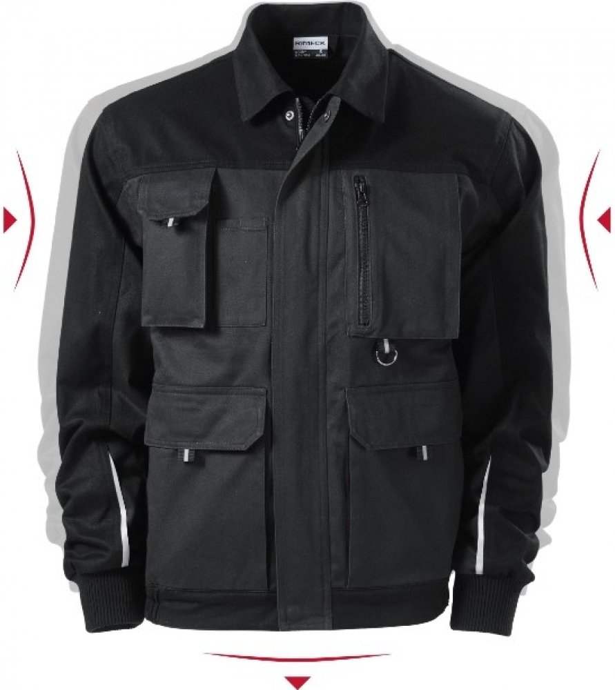 Materiál je kepr (100% bavlna, 270 g/m2). Celopropínací kostěný zip s klopou. Multifunkční kapsy. Elastické manžety na rukávech.