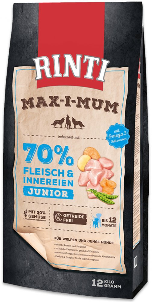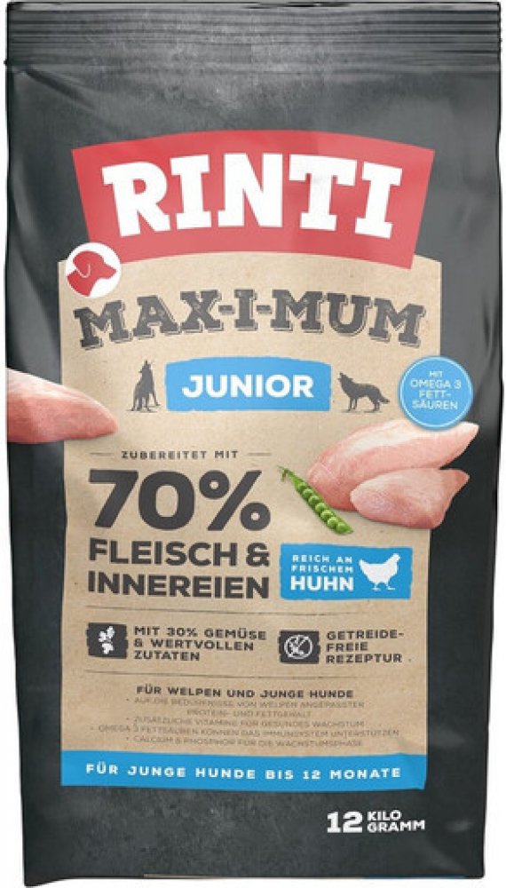 RINTI MAX-I-MUM Junior je suché krmivo s kuřecím masem pro štěňata a mladé psy do 12 měsíců s vysokým obsahem bílkovin a tuků, vitamínů a přírodních omega-3 mastných kyselin. Bohaté na čerstvé kuře a zeleninu, bez obilovin.