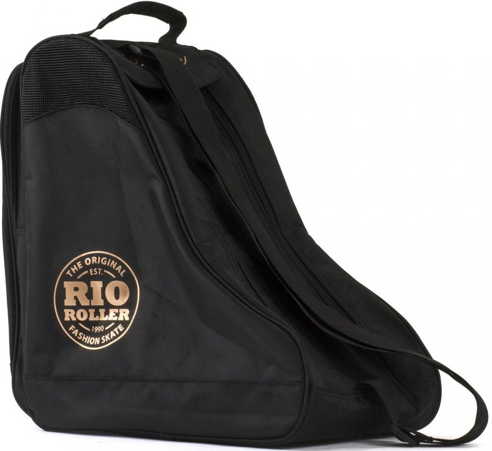 Rio Roller - Rose Bag - Rose Gold - obal na brusle Rozměry: 34 cm x 34 cm x 20 cm pro brusle do veliksoti EU44 Odolný Heavy Duty materiál 600D PVC – vodě odolný Potisk loga Vnitřní a zadní kapsy Vnitřní deska pro maximální pevnost konstrukce Průduchy – cirkulace vzduchu Základna s plastovými nožičkami Nastavitelný ramenní popruh