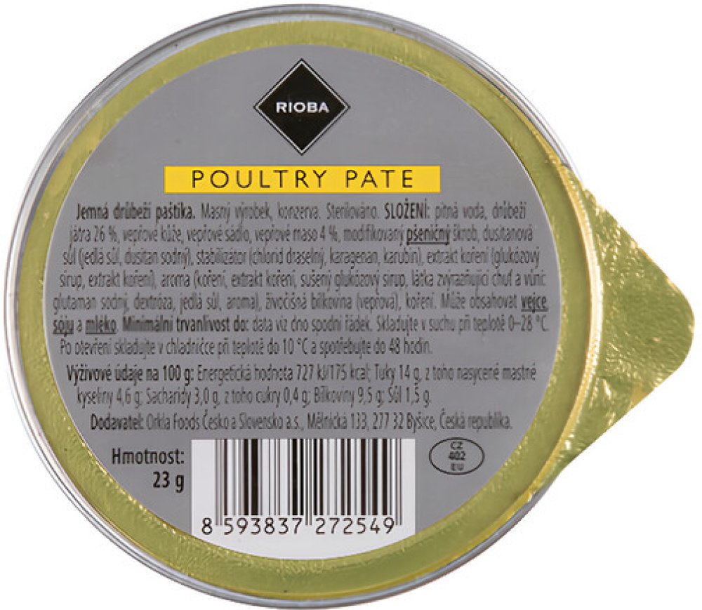 -- Rioba Paštika drůbeží 23 g.Ideální k rychlému občerstvení, snídani nebo jako součást obložených mís. Má hladkou konzistenci a vyváženou chuť, která vynikne s čerstvým pečivem.Poznejte jedinečnou chuť RIOBARioba je exkluzivní privátní značka Makro.…