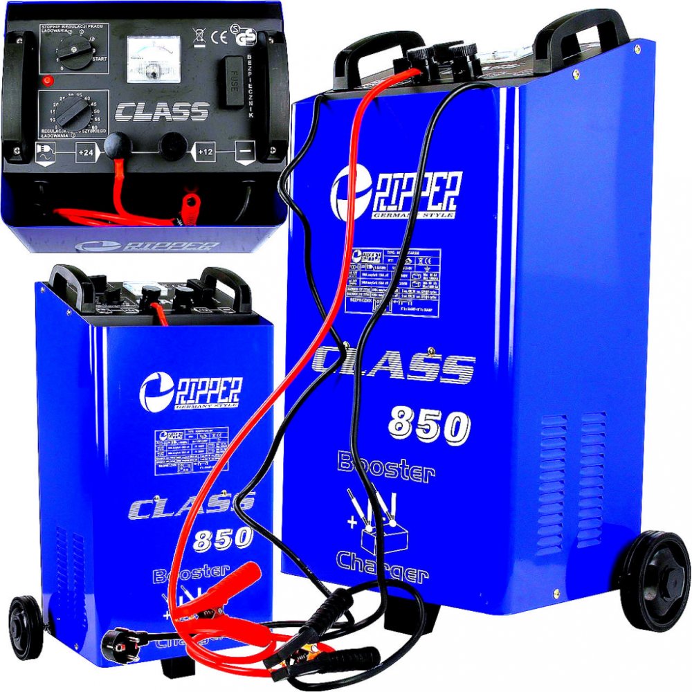 Nabíječka autobaterií – startovací zdroj, 12 V/24 V, pro olověné autobaterie s kapacitou 80-1000 Ah, pojízdný – RIPPER Class 850. Pojízdná, profesionální autonabíječka je určena pro nabíjení olověných autobaterií nákladních automobilů, autobusů, zemědělských strojů apod. a disponuje funkcí nouzového startování pro vybité baterie neschopné nastartovat. Velmi jednoduché ovládání – přepínání knoflíky, zabudovaný ampérmetr pro snadnou kontrolu průběhu nabíjení. Kovové tělo nabíječky s kolečky a madly umožňuje jednoduché a bezpečné přesouvání podle potřeb. 50 A pojistka chrání vnitřní okruh přístroje a lze ji jednoduše vyměnit. Připojení k autobaterii probíhá pomocí izolovaných krokosvorek, které umožňují pevné a bezpečné připojení. Přístroj disponuje prostorem pro umístění kabelů, díky kterému
