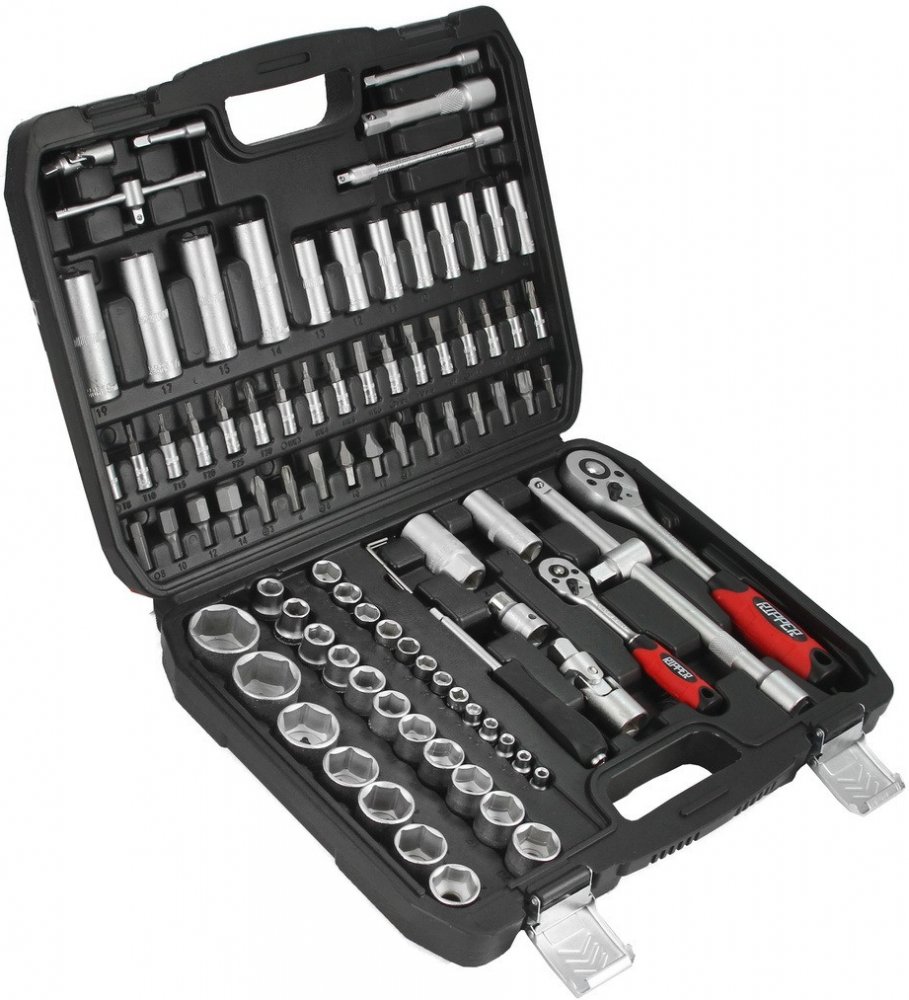 Gola sada 94 dílná značky Ripper Germany, vyrobená z chrom vanadové oceli CrV v plastovém kufru.Sada obsahuje:17 ks 1/2" nástavců 10, 11, 12, 13, 14, 15, 16, 17, 18, 19, 20, 21, 22, 24, 27, 30, 32 mm5ks 1/2" nástavců prodloužených 14, 15, 17, 19, 22 mmnástavce na svíčky 1/2" - 16, 21 mmnástavce 1/4" 4, 4.5, 5, 5.5, 6, 7, 8, 9, 10, 11, 12, 13, 14 mmnástavce prodloužené 1/4" - 6, 7, 8, 9, 10, 11, 12, 13 mmnástavce 1/4" s bitytorx (T8, 10, 15, 20, 25, 27, 30)imbus(3, 4, 5, 6 mm), PZ (1, 2), PH (1, 2), ploché (4, 5.5, 6,5 mm)bityimbus (7, 8, 10, 12, 14 mm), PH (3,4)ploché (8, 10, 12 mm), PZ (3, 4), Torx (T40, 45, 50, 55, 60)nástavce 1/2" E-kulicka - E10, E11, E12, E14, E16, E18, E20, E24nástavce 1/4" E-kulicka - E4, E5, E6, E7, E8adaptér 1/2" k nástavcem a bitemadaptér 1/2"ráčny 1/2" a 1/4"prodlužovák 1/2" - (125, 250 mm)prodlužovák 1/4" - (50, 100 mm)průchodky 1/2"t-kus čtvercový 1/4"kloubové lámací prodlužovák 1/2" a 1/4"imbus typ L (1.5, 2, 2,5 mm)nástavce torx na 1/2" a 1/4"