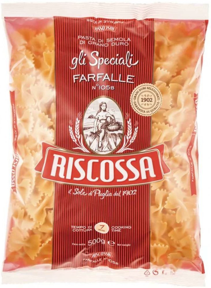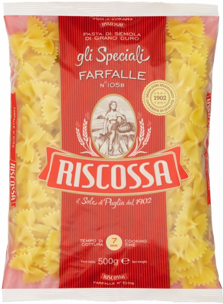 Farfalle mašle RISCOSSA 500g Mašle jsou italské těstoviny ze semoliny z tvrdé pšenice (Triticum durum). V suchém stavu jsou přibližně 3 cm velké. Vyzkoušejte! Farfalle boscaiole Sušené hřiby předem namočte a slijte. Na másle smažte cibulku, přidejte hřiby, lístky šalvěje, česnek, sůl a vařte 5 minut. Přidejte 150 ml suchého bílého vína a mírně povařte. Zjemněte lžící mascarpone, dochuťte solí a pe...