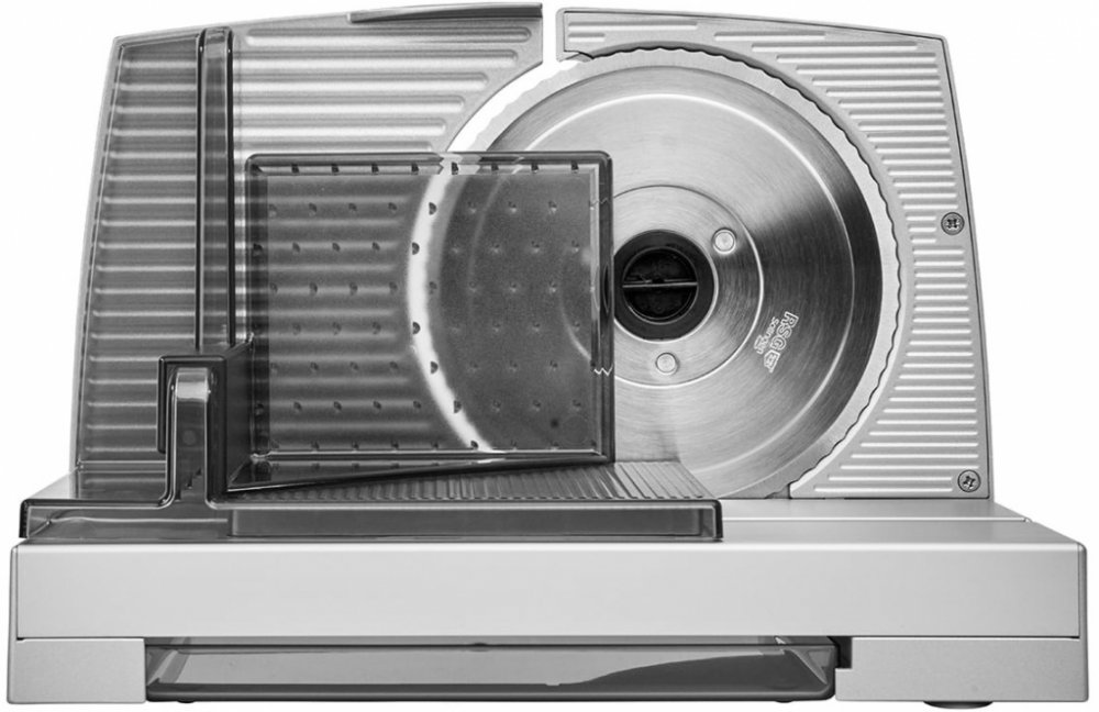 Samonosná kovová konstrukce s elegantní podlahovou deskou ze skla umožňuje přímé ukládání chutně řezaných plátků přímo na talíře a mísy. Spodní deska potravinového kráječe je vyrobena z kvalitního, odolného skla a dodává zařízení exkuzivní vzhled.