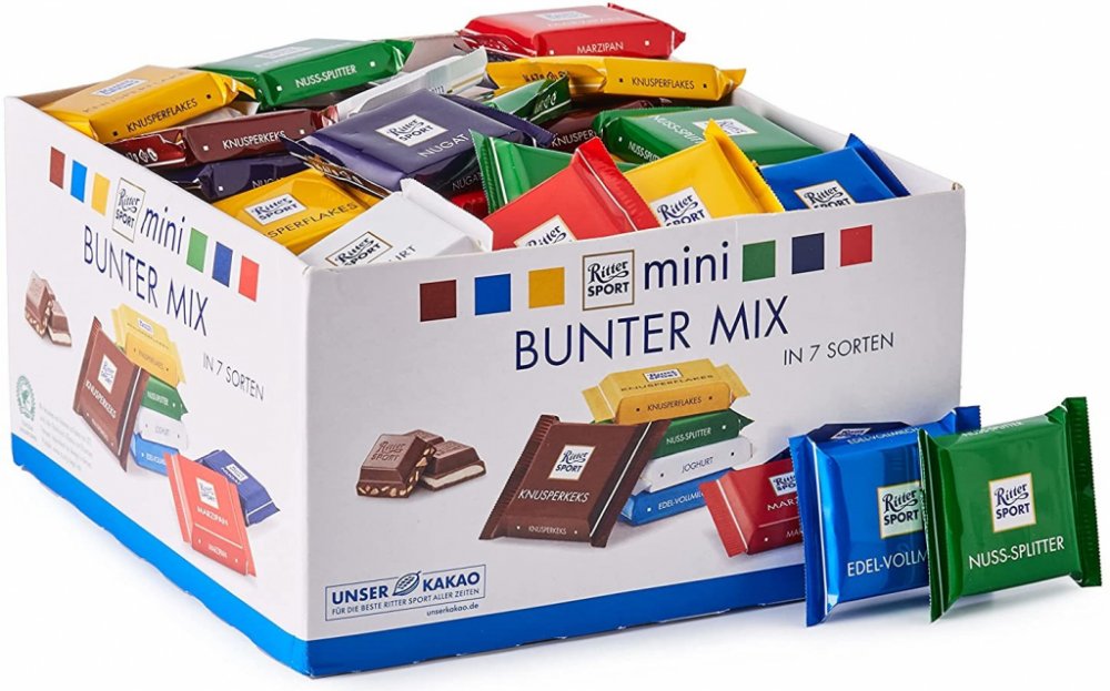 7 druhů v jednom balení zajistí, že si každý vybere čokoládu podle svého vkusu: alpskou mléčnou, nugát, s lískovými oříšky, kukuřičnými lupínky, keksem, marcipánem nebo jogurtem.