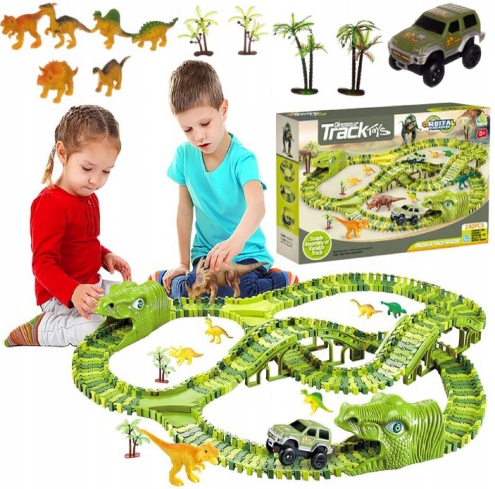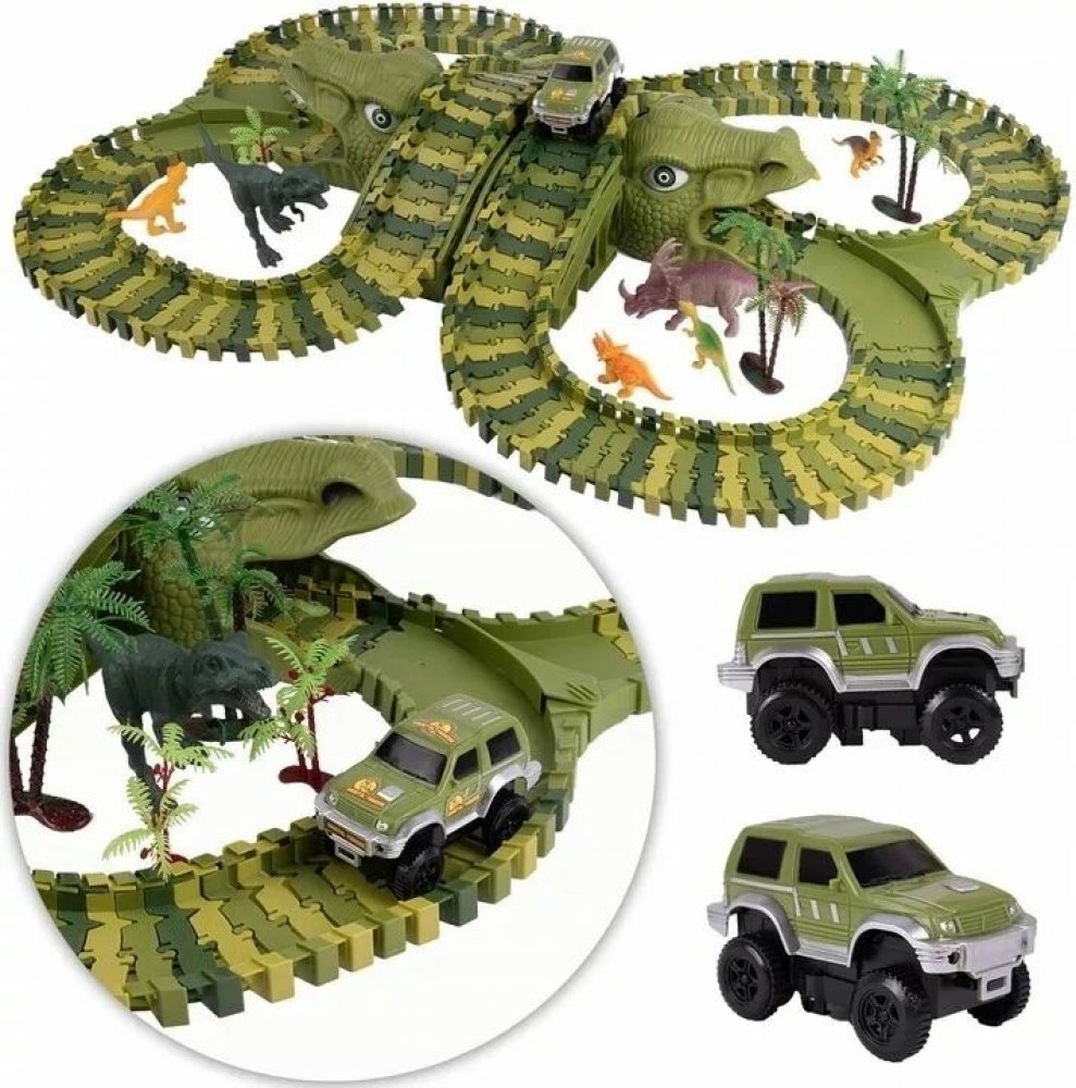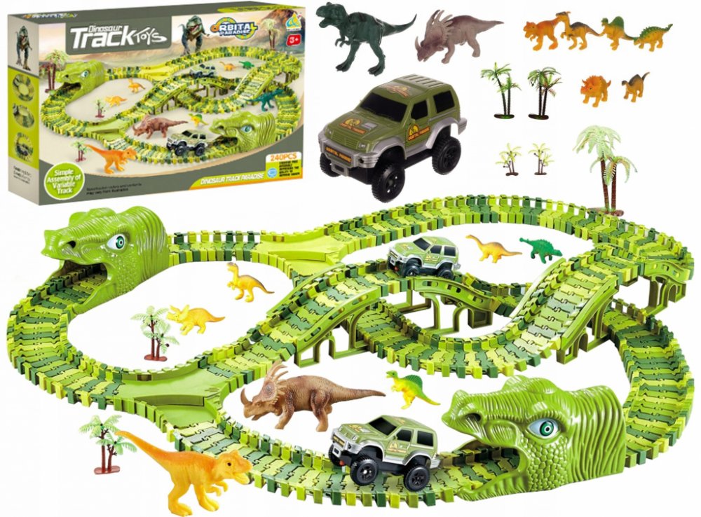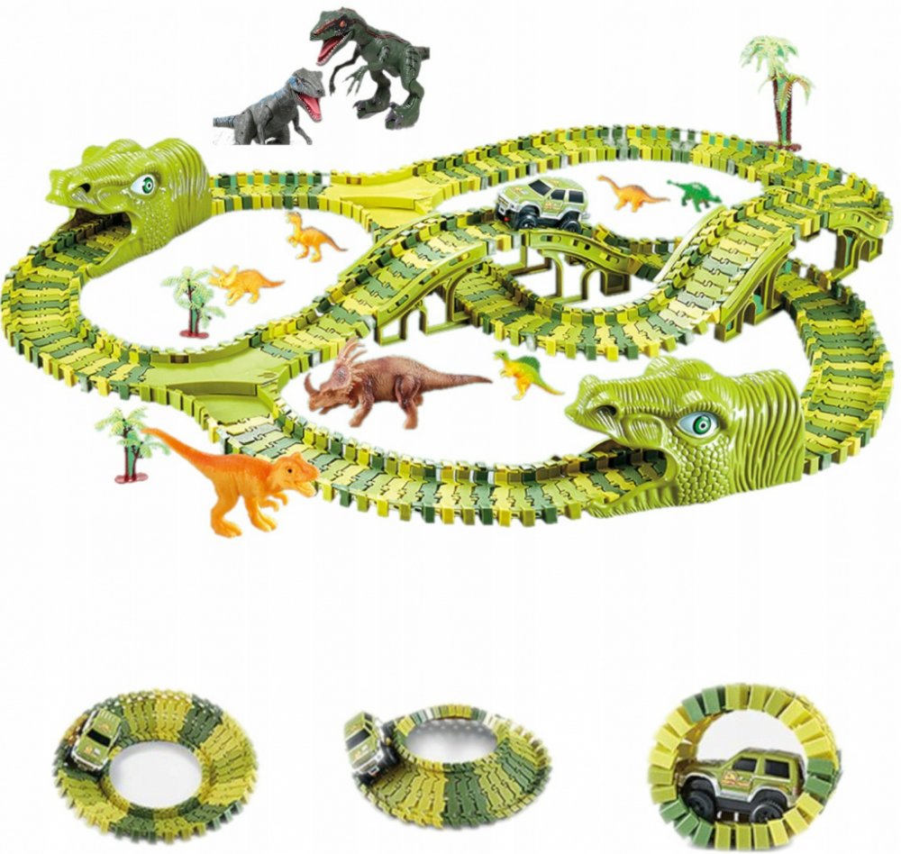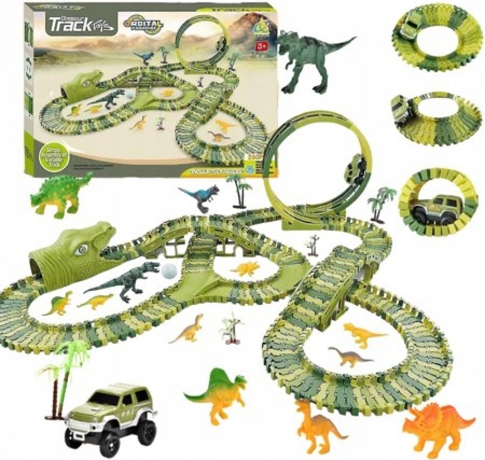 Je vaše dítě fanouškem dinosaurů a autodráh? Pak je tato autodráha přímo pro něj! Skvělá dráha složená z více než 240 prvků o délce 360 cm. Zavedeme vaše dítě do divokého světa dinosaurů. Sada obsahuje flexibilní dráhu ve 4 odstínech zelené. Kromě toho dráha obsahuje 2 výhybky, 2 mosty a dva tunely ve tvaru dinosauřích hlav. Autodráhu je možné postavit v jakémkoli tvaru, pohybuje se po ní autíčk...