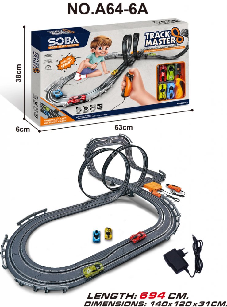 Užijte si napínavé závody s autodráhou TRACK MASTER o délce 694 cm. Velký set pro děti od 6 let nabízí dvě 360° smyčky, ostré zatáčky a rychlé rovinky. V balení najdete 2 závodní auta se vyměnitelnými karoseriemi a 2 ovladače. Dráhu můžete napájet adaptérem (v balení) nebo bateriemi.Postavte si vlastní závodní okruh ve škále 1:64 a vyzkoušejte, kdo bude v cíli první. Autodráha TRACK MASTER kombinuje dlouhé rovinky s dvěma pútavými smyčkami 360° a technickými pasážemi, takže děti i dospělí zažijí spoustu akční zábavy.Součástí jsou 2 rychlá autíčka, 2 ovladače a vyměnitelné karoserie pro změnu vzhledu a atmosféry závodu. Díky možnosti napájení adaptérem 9 V (součást balení) nebo 6× AA bateriemi (nejsou součástí) je set flexibilní doma i na cestách.Délka dráhy: 694 cm s možností dynamického rozloženíPro děti: od 6 letNapájení: adaptér nebo baterie pro pohodlný provozObsahuje: konstrukční díly dráhy, 2 auta, 2 vyměnitelné karoserie, 2 ovladače, adaptér, dekorativní samolepky a návodSpecifikaceMěřítko1:64Celková délka dráhy694 cmPrvky trati2× smyčka 360°, ostré zatáčky, rovinkyVěk6+Počet vozidel2 závodní autaVyměnitelné karoserie2 ksOvladače2 ksNapájení dráhyadaptér 9 V (součástí) nebo 6× AA 1,5 V (nejsou součástí)Rozměry sestavené dráhycca 140 × 120 × 31 cmRozměry autíčkacca 8 × 3 × 3,5 cmRozměry balenícca 63 × 38 × 6 cmObsah balenídíly trati, 2 vozidla, 2 vyměnitelné karoserie, 2× ovladač, adaptér, samolepky, návod
