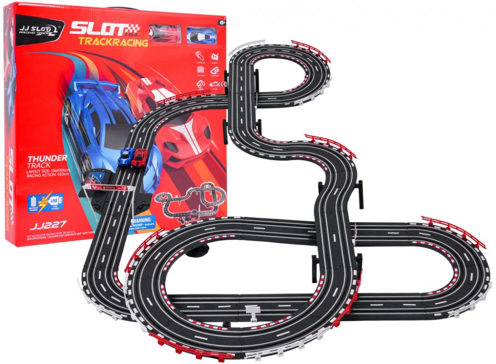 Užijte si napínavé domácí závody s autodráhou TRACK SPORT o celkové délce 553 cm. Tříúrovňové uspořádání, rychlé rovinky, ostré zatáčky se zábranami a 2 závodní autíčka v měřítku 1:64 zajistí skvělou zábavu pro děti od 6 let. Dráha funguje na baterie nebo po připojení k napájení (USB kabel v balení).Závodní sada TRACK SPORT přináší dynamickou jízdu na třípatrové trati s celkovou délkou 553 cm. Kvalitní a odolné díly zajistí stabilitu, zatímco bezpečnostní bariéry v ostrých zatáčkách pomáhají udržet autíčka na trati. Díky dvěma ovladačům si užijete férové souboje ve dvou.Dráhu lze napájet buď 4× AA 1,5 V (nejsou součástí), nebo ji připojit pomocí USB kabelu k adaptéru. Autíčka v měřítku 1:64 nabízejí ideální poměr rychlosti a ovladatelnosti pro děti od 6 let.Tříúrovňová trať – rovinky, zatáčky, spirály pro plynulý a zábavný průběh závodu.Bezpečnostní bariéry – snižují vypadávání autíček v ostrých obloucích.Hra pro dva – v balení 2 autíčka a 2 ruční ovladače.Dvojí napájení – baterie nebo napájení z adaptéru přes USB.Snadná montáž – přehledné stavební díly a návod.SpecifikaceVěkod 6 letCelková délka dráhycca 553 cmRozměry sestavené dráhycca 106 × 136 cmPočet úrovní3Prvky tratěrovinky, ostré zatáčky, spirály, bezpečnostní bariéryMěřítko autíček1:64Rozměry autíčekcca 7,5 × 2,5 × 3,5 cmNapájení4 × AA 1,5 V (nejsou součástí) nebo USB napájeníPříslušenství v balenístavební díly dráhy, 2 autíčka, 2 ovladače, USB kabel k napájení, návodRozměry balenícca 45 × 44 × 7,5 cm
