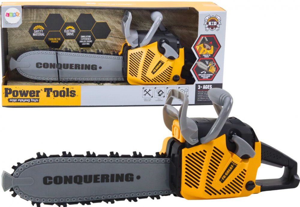 Realistická dětská motorová pila na baterie s bezpečným gumovým řetězem nabízí světelné a zvukové efekty, snadné ovládání a odolné zpracování. Skvělá pro kreativní hru na řemeslníky a rozvoj jemné motoriky a koordinace. Vhodná pro děti od 3 let, s certifikací CE a shodou s EN71.