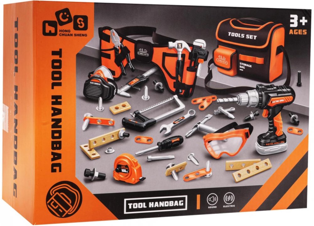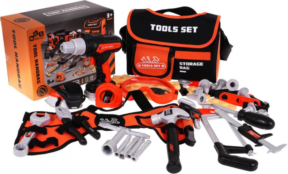 Tato bohatě vybavená sada nářadí nabídne dětem realistické pracovní zážitky. Plastová aku vrtačka v černo‑oranžové barvě má vyměnitelné bity, dva směry otáčení pro utahování i povolování a vyjímatelný „akumulátor“ pro ještě věrohodnější hru. Napájení: 2× AA 1,5 V (nejsou součástí balení).Praktická taška na nářadí s hlavní komorou na suchý zip, přední kapsičkou a průvlekem pro šroubovák udrží vše pěkně pohromadě. Nastavitelný pás na nářadí pomůže mít nejdůležitější pomůcky vždy po ruce. Sada zahrnuje i bohaté příslušenství: šroubováky s nástavci, klíče, kleště, kladivo, úhelník, metr, „dřevěné“ spojovací prvky, šrouby, matice, hmoždinky, ochranné brýle a další.Proč si vybrat tuto sadu:Realistická hra díky elektrické vrtačce s bity a příslušenstvím.Pořádek a přenosnost – taška přes rameno a pracovní pás.Rozvoj dovedností – motorika, koordinace, kreativita a role‑play.SpecifikaceVěk3+ rokyPočet dílů48Napájení vrtačky2× AA 1,5 V (nejsou součástí)MateriálPlastRozměry taškycca 23 × 17 × 10,5 cmRozměry pásudélka cca 35 cm × 14,5 cm, max. obvod cca 88 cmRozměry vrtačkycca 15 × 15 × 5 cmDélka bitů / nástavcůcca 6,5–8 cmNasadka ke šroubovákucca 8 × 3 cmÚhelník (míra úhlů)cca 17 × 6 cmFrancouzský klíčcca 18 × 5 cmKombinovaný klíčcca 14 × 4 cmKleštěcca 15 × 4,5 cmKladivocca 16,5 × 8 cmMenší spojovací díly3 ks, cca 6 × 2,5 cmVětší spojovací díl1 ks, cca 9 × 2,5 cm„Dřevěné“ lišty6 ks, délka 6,5–16 cmŠrouby6 ks, cca 5,5 × 1,5 cmPodložky6 ks, průměr cca 3 cmMetrcca 5,5 × 6 × 2,5 cmMaskacca 8 × 8 × 4 cmOchranné brýlecca 14,5 × 6 × 3 cmHmoždinky6 ks, cca 5 × 3 cmPilkacca 20 × 6,5 × 2 cmBalenícca 24 × 17,5 × 12 cm
