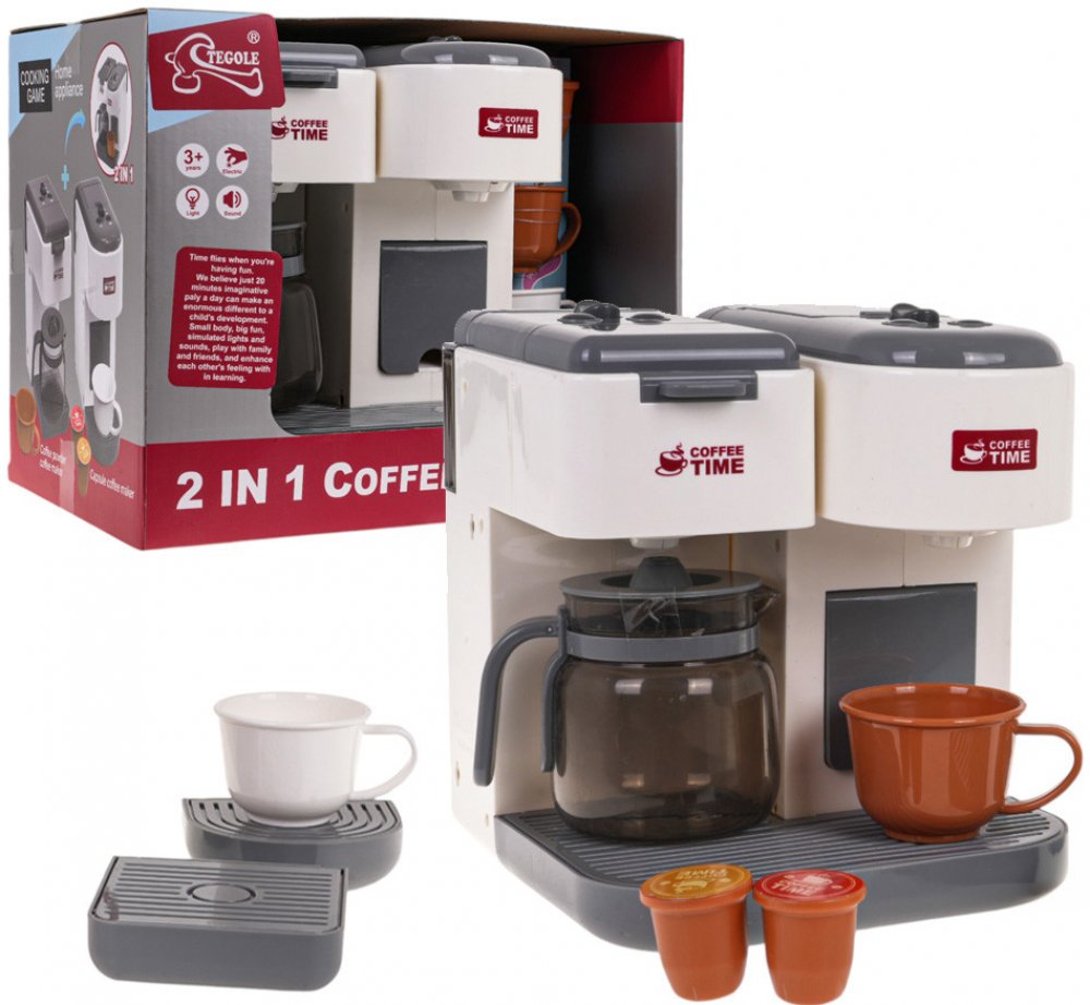 Interaktivní kávovar pro děti nabízí zábavný zážitek s realistickými funkcemi zaparovacího systému a kapsulového kávovaru. Ideální pro děti od 3 let.Interaktivní dvoudílný set zahrnuje zaparovač a kapsulový kávovar, který zaujme svým realistickým vzhledem a funkcemi. Děti mohou zároveň používat oba přístroje nebo je oddělit a hrát si s každým zvlášť. Kávovar disponuje otevíratelnou přihrádkou na kávu, nádrží na vodu a třemi tlačítky pro přípravu malé či velké kávy a spouštění funkce vody. Při vaření kávy se ozývají realistické zvuky a červené světélko bliká při výstupu vody.Hlavní funkce setu:Vhodné pro děti od 3 letVyrobeno z kvalitního plastuRealistický designFunkce tekoucí vody a zvuky vařeníBlikající světélko při výstupu vodyZápustný kávovar a kapsulový kávovar v jednomMožnost spojení obou zařízení nebo samostatné hryRůznorodé příslušenství v setuSpecifikaceRozměry- Set do kávy přibližně 18 cm x 20 cm x 20 cm,- Zaparovač kávy přibližně 20 cm x 16,5 cm x 9 cm,- Kapsulový kávovar přibližně 20 cm x 21 cm x 9 cm,- Džbán přibližně 9 cm x 10,5 cm x 8,5 cm,- Hrnek přibližně 4,5 cm x 8,5 cm,- Kapsule přibližně 4 cm x 3,5 cm,- Balení přibližně 33 cm x 23 cm x 21 cm.