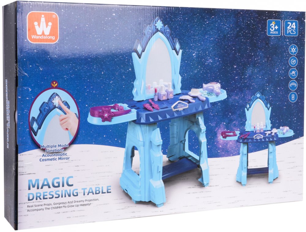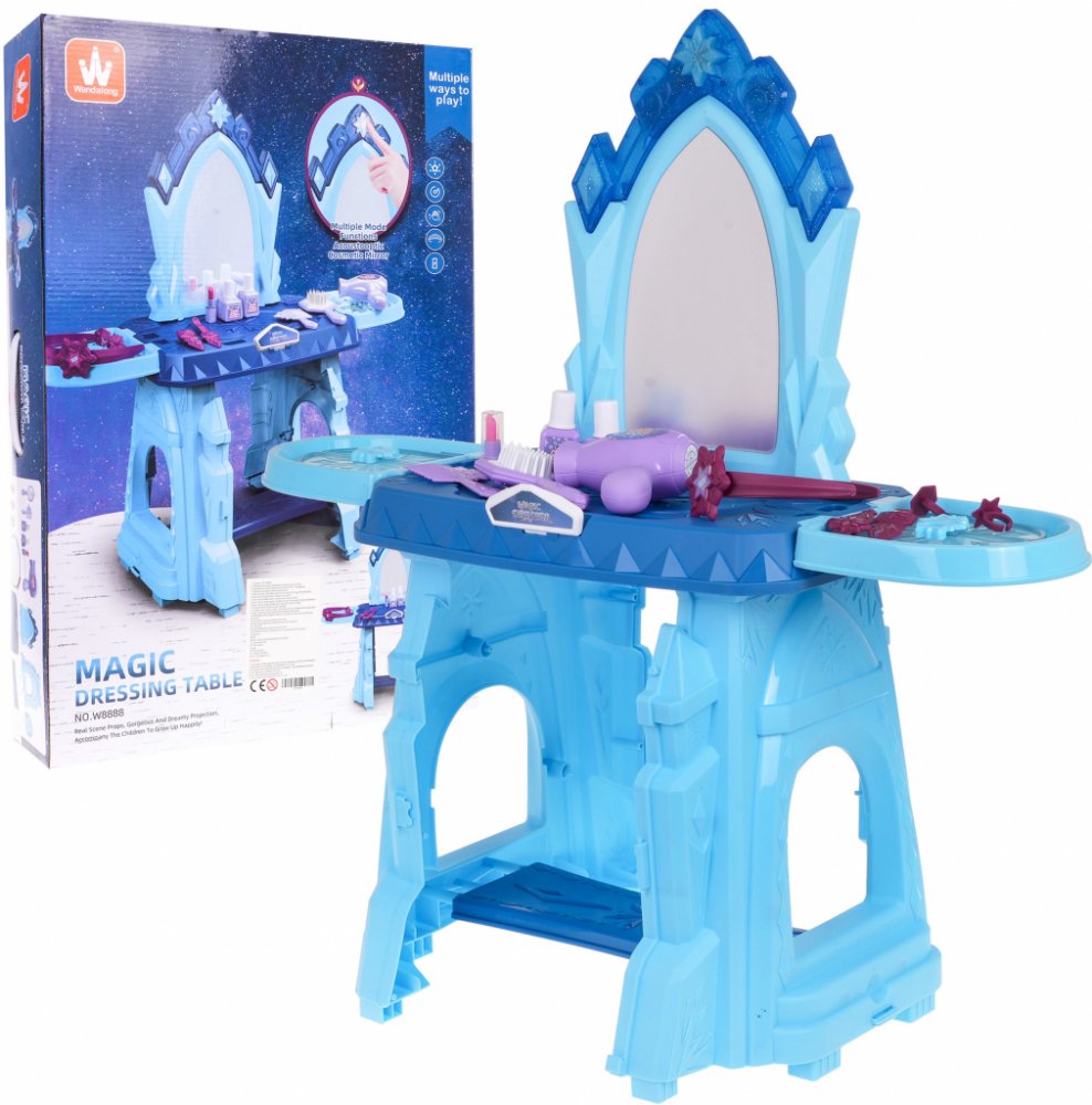 PopisToaleta Blue Princess + příslušenství Interaktivní toaletka se zvukovou a světelnou funkcí je vhodná pro děti od 3 let. Sada obsahuje toaletní stolek a figurínu kosmetiky a šperků. Toaletní stolek má velké zrcadlo a nad ním je tlačítko ve tvaru hvězdy, které po stisknutí aktivuje zvukové a světelné efekty. Deska stolku a poličky po stranách toaletního stolku mají výklenky na kosmetiku a šperk...