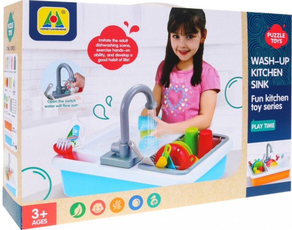 PopisDřez s příslušenstvím pro vodovodní baterie Tato sada je ideální pro chlapce i dívky.Je to skvělý způsob, jak dítě přivést k návyku uklízet po jídle, a zároveň skvělá zábava.Po naplnění nádoby vodou, nasazení víčka a otočení knoflíku kohoutku teče voda v uzavřeném okruhu.Proud vody je jemný, takže se nemusíme obávat nepořádku.Hračka je vhodná pro děti od 3 let a má certifikát CE.Hračka je napájena 2 x AA bateriemi (nejsou součástí dodávky).Obsah sady- modré umyvadlo o rozměrech cca 39 cm x 27 cm x 9 cm,- 2 malé nože o rozměrech cca 9,5 cm x 2,5 cm,- velký nůž cca 13 cm x 2,5 cm,- 2 vidličky cca 10 cm x 3 cm,- kartáč cca 10,5 cm x 5 cm,- mixér cca 14 cm x 8 cm x 5,5 cm,- 2 malé talíře o velikosti cca 9 cm ,- 2 velké talíře cca 11 cm,- 2 šálky o rozměrech cca 6,5 cm x 4,5 cm,- 2 malé šálky cca 4,5 cm x 6 cm,- kohoutek cca 17,5 cm x 2 cm,- stojan na nádobí cca 24 cm x 14,5 cm x 7,5 cm,- mycí prostředek cca. 8 cm x 5 cm,- návod k použití.Rozměry Rozměry balení cca. 41 cm x 27,5 cm x 10,5 cm