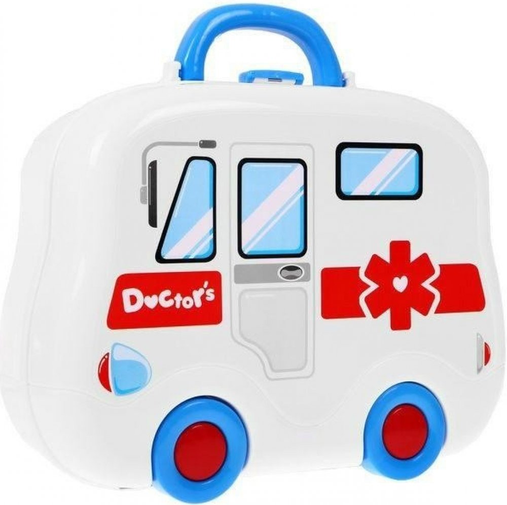 Obsah soupravyLékařská souprava s nářadím, kufr s držadlem, sanitka na kolečkách - (ZLE.008-918) Lékařská sada s nástroji pro děti od 3 let.Vybavení sady:- přenosný skládací kufřík - ambulance na kolečkách,- stolní deska s imitací MRI,- 2 boční police,- věšák na lékařské potřeby,- brýle,- nůžky,- nůžky s kleštěmi,- teploměr,- injekční stříkačka,- pinzeta,- spekulum,- zrcátko,- kladívkoRozměry - kufřík 26,5 cm x 21 cm x 9,5 cm,- balení 27 cm x 21 cm x 10 cm.