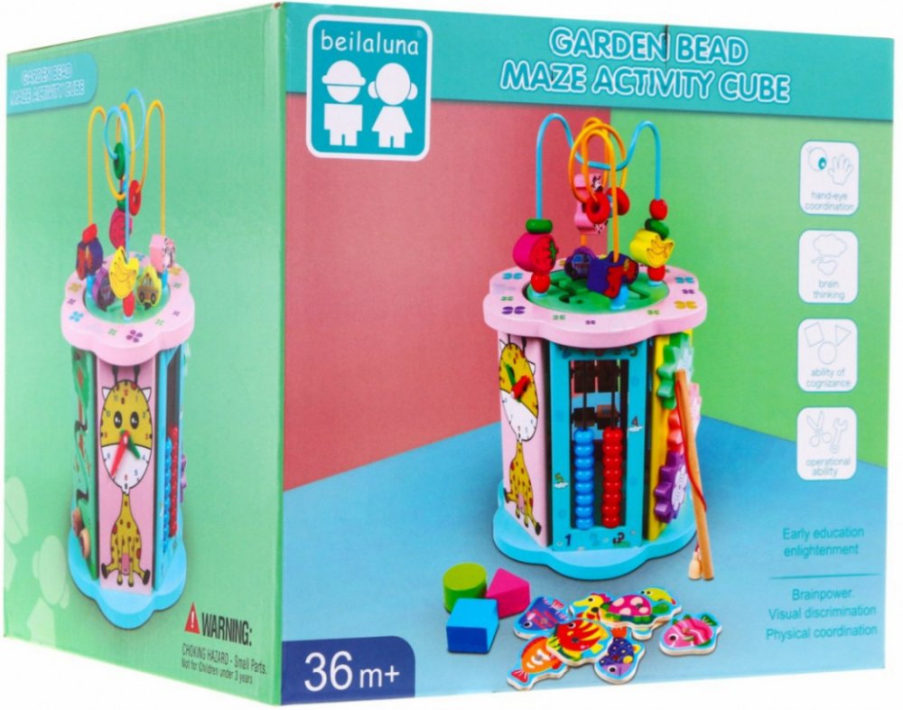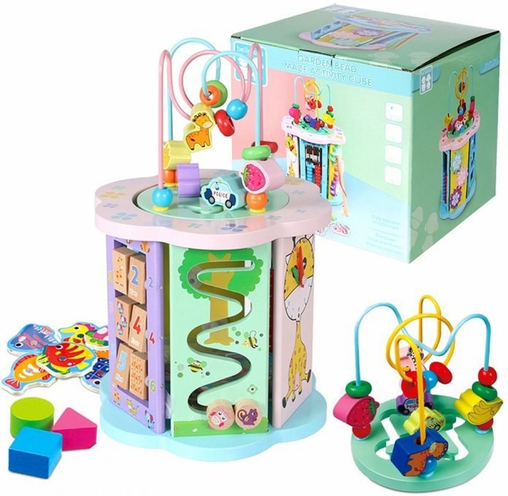 PopisDřevěná multifunkční kostka 8v1 (ZDR.BLLN-2178) Vzdělávací dřevěná multifunkční kostka je pomůcka pro učení hrou. Je určena pro děti od 3 let. Je vyrobena z bezpečných materiálů, dřevo bylo natřeno netoxickou barevnou barvou v oku lahodících pastelových barvách. Má zjednodušený tvar bez ostrých konců.V horní části se nachází bludiště s korálky, ovocem a zvířátky a s autíčky klouzajícími po dr...