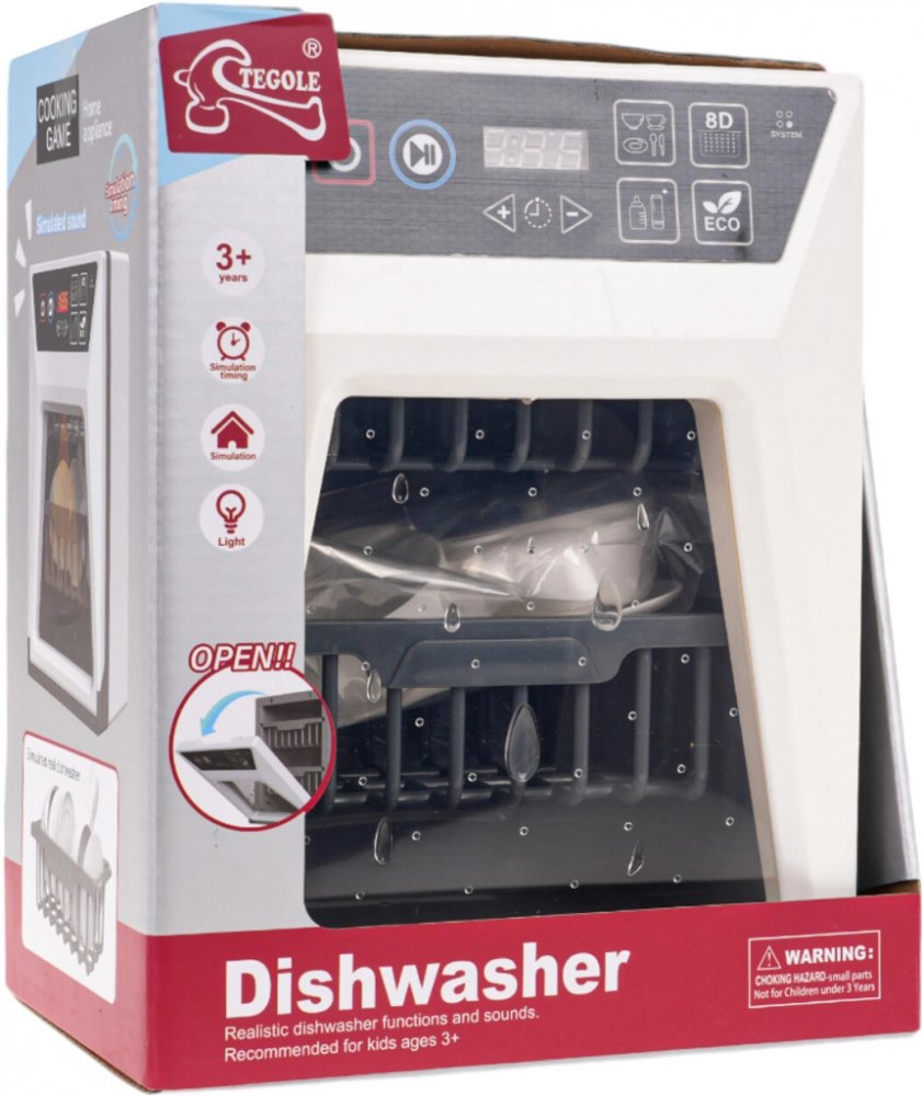Tato interaktivní myčka vypadá jako opravdová – po stisku tlačítka na dotykovém panelu spustí zvolený program, rozsvítí se světla a ozvou se realistické zvuky. Dvířka se otevírají a dovnitř vložíte vyjímatelný koš na nádobí. Díky přehlednému displeji s odpočtem času děti snadno sledují průběh „mytí“.Hračka je vyrobena z kvalitních a bezpečných materiálů a je vhodná pro děti od 3 let. Balení obsahuje také kuchyňské doplňky, se kterými si děti procvičí jemnou motoriku i fantazii.Ovládací prvky: start, pauza, displej s odpočtem, programová tlačítkaFunkce: světelné a zvukové efekty, odpočet času, otevíratelná dvířka, vyjímatelný košPříslušenství: talířek, hrnec s pokličkou, pánev, nůž, vidlička, lžičkaSpecifikaceVěkod 3 letNapájení2× AA 1,5 V (nejsou součástí)Ovládánídotykový panel: start, pauza, volba programu, displej s odpočtemFunkcesvětelné a zvukové efekty, odpočet času, otevíratelná dvířka, vyjímatelný košRozměry myčkycca 24,5 × 13 × 18,5 cmTalířekprůměr cca 7 cmHrnec s pokličkoucca 3 × 8 cmPánevcca 10 × 6,5 × 2 cmPříborynůž, vidlička, lžička cca 9 cmRozměry balenícca 20,5 × 25,5 × 14,5 cmMateriálkvalitní plast bezpečný pro dětiObsah balenímyčka, talířek, hrnec s pokličkou, pánev, nůž, vidlička, lžička