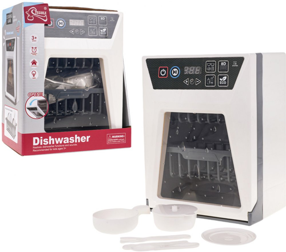 Realistická dětská myčka nádobí s funkčním světlem a zvuky potěší malé pomocníky od 3 let. Má dotykový panel se startem, pauzou a časovačem programu, otevíratelná dvířka a vyjímatelný koš. Součástí je sada příslušenství – talířek, hrnec s pokličkou, pánev a příbory. Napájení 2× AA (nejsou součástí).