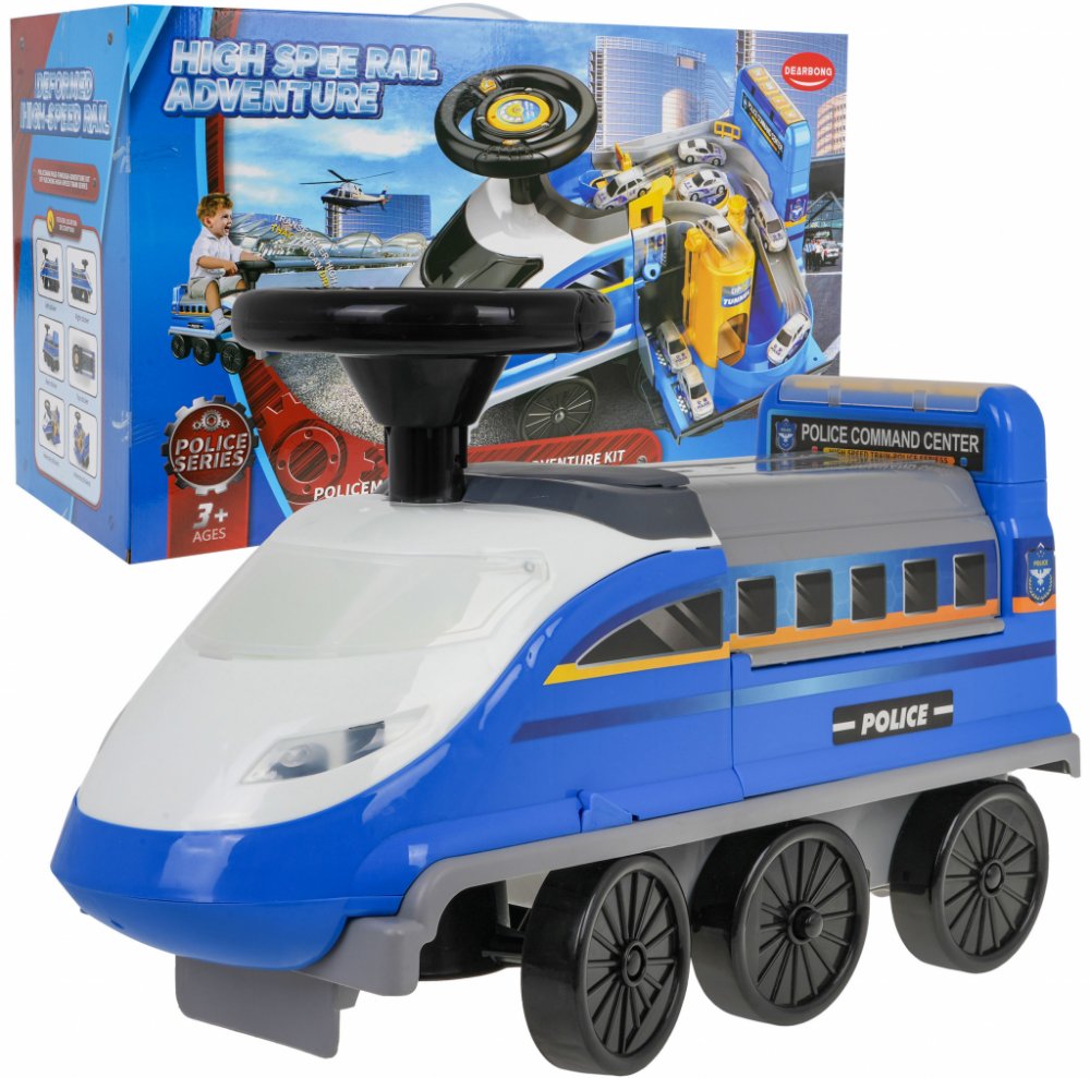 Modrá jezdicí lokomotiva je plná interaktivních zábavných prvků s policejním parkovištěm. Má šest kol, z nichž dvě jsou otočné. Skryté policejní parkoviště pod sedátkem obsahuje různé hry, jako skluzavku, výtah nebo otočné kolo, vše ovládané ručně. Dále nabízí úložné místo pro hračky nebo skrytý prostor pod čelním sklem pro maličkosti. Vysouvací opěrky zajišťují pohodlí dítěte. Lokomotiva je vybav...