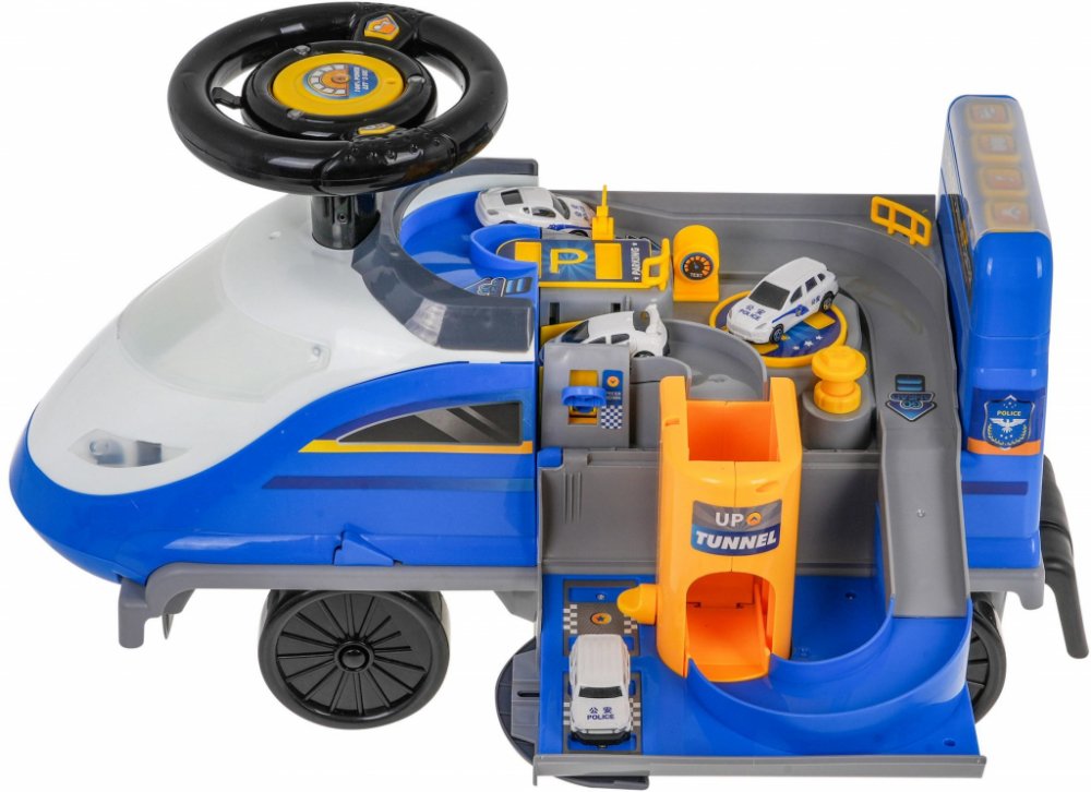 Modrá jezdicí lokomotiva je plná interaktivních zábavných prvků s policejním parkovištěm. Má šest kol, z nichž dvě jsou otočné. Skryté policejní parkoviště pod sedátkem obsahuje různé hry, jako skluzavku, výtah nebo otočné kolo, vše ovládané ručně. Dále nabízí úložné místo pro hračky nebo skrytý prostor pod čelním sklem pro maličkosti. Vysouvací opěrky zajišťují pohodlí dítěte. Lokomotiva je vybavena bateriemi, které napájejí funkce volantu a zvukového panelu na zadní straně, včetně anglických pohádek a zvířecích zvuků.