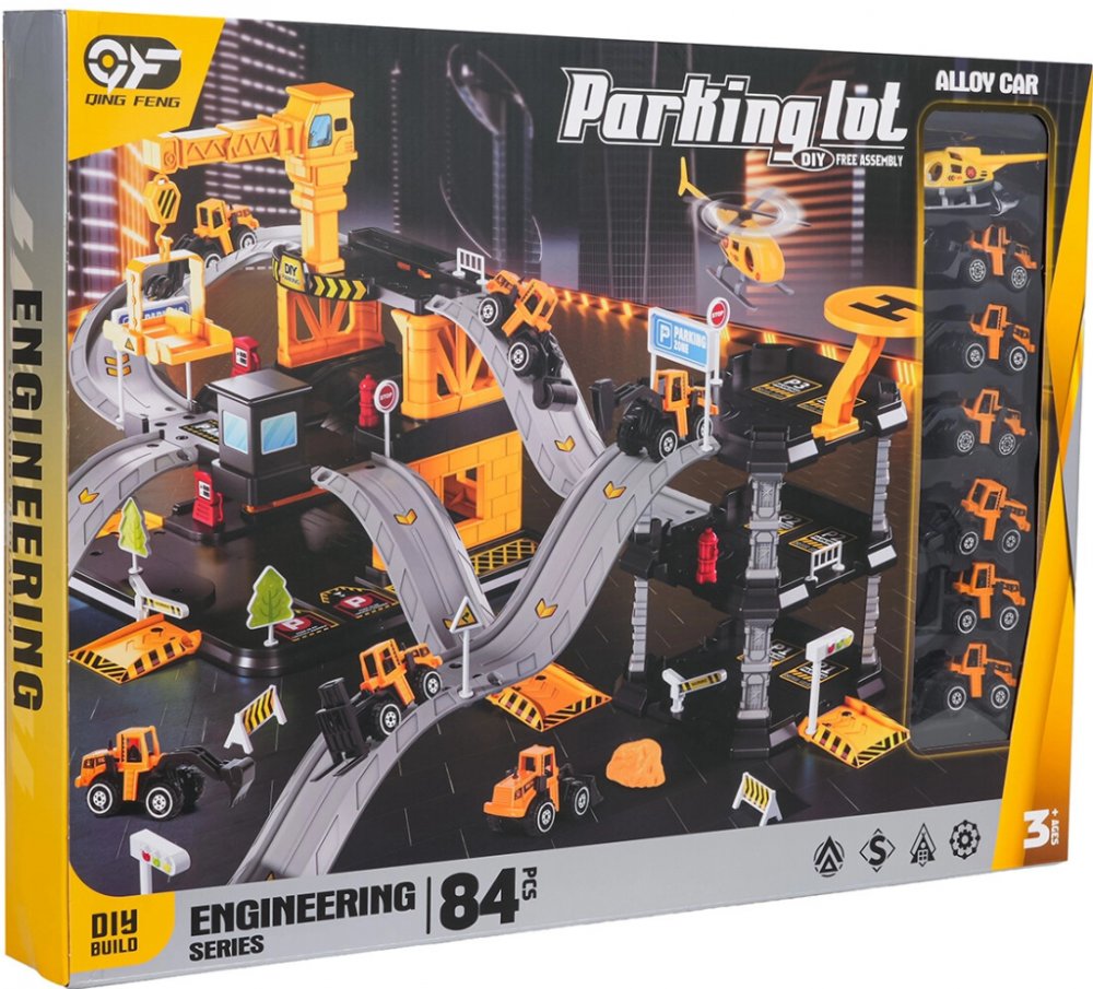 Třípatrové parkoviště s heliportem je propojeno třípatrovým staveništěm s rampami a jeřábem. Děti mohou plynule jezdit mezi zónami a vytvářet vlastní stavební scénáře.