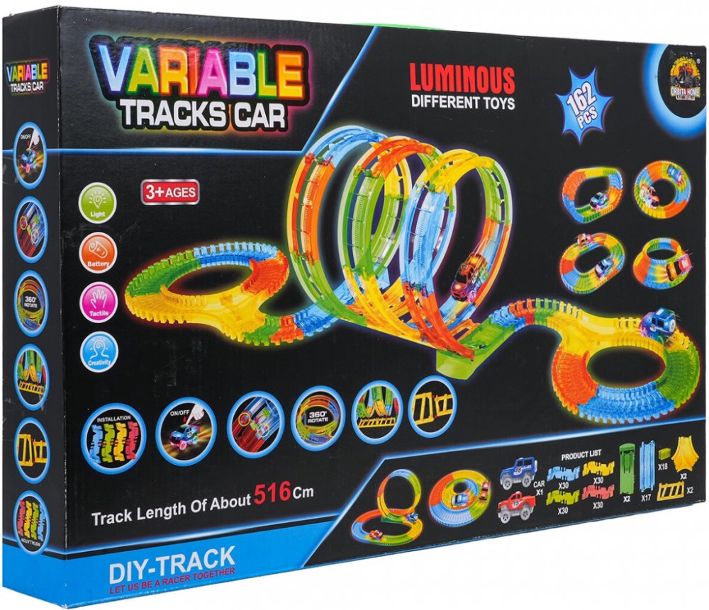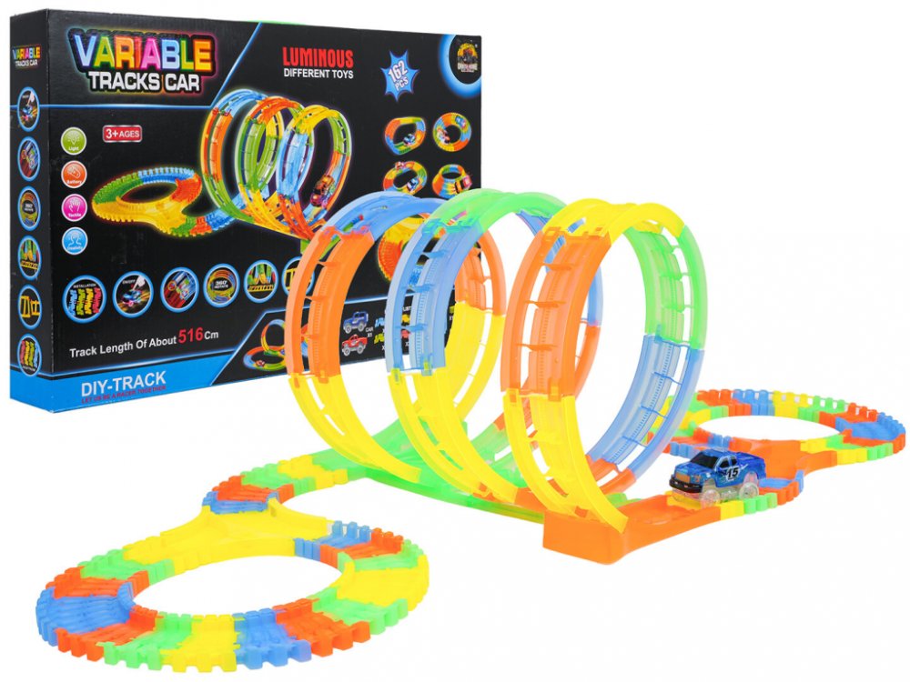 Zábavná a kreativní autodráha pro děti od 3 let se skládá ze 162 flexibilních dílů a jedním autíčkem s LED osvětlením. Díky pružným dílům můžete trať libovolně tvarovat, vytvářet smyčky a efektní kombinace. Dráha svítí ve tmě a spolu s LED autíčkem vytváří působivý světelný efekt. Celková délka 516 cm zajistí dlouhé hodiny hry a fantazie.Objevte kouzlo nočních závodů s autodráhou, která svítí ve tmě. Díly jsou flexibilní, takže je snadno otočíte, zvednete či přestavíte i během jízdy autíčka. Jednoduché ovládání na střeše auta a LED podsvícení zaručí parádní vizuální podívanou.Autodráha je ideální pro rozvoj kreativity, jemné motoriky a představivosti. Děti si mohou trať stavět znovu a znovu – od přímých úseků přes smyčky až po vyvýšené části. 516 cm celkové délky poskytuje dostatek prostoru pro originální závodní výzvy.Pro děti od 3 let – bezpečná a intuitivní zábava162 dílů pro nekonečné kombinaceAutíčko s LED efektem, napájené 2× AA (nejsou součástí)Fluorescenční díly – dráha září ve tměSnadné ovládání – tlačítko na střeše autíčkaSpecifikaceVěkod 3 letPočet dílů162Celková délka dráhy516 cmNapájení autíčka2× AA 1,5 V (nejsou součástí balení)EfektyLED podsvícení autíčka, fluorescenční (svítí ve tmě) dílyRozměry autíčkacca 9,5 × 6 × 5,5 cmOrientační rozměry sestavené dráhycca 148 × 57 × 32 cmRozměry balenícca 54 × 7 × 35 cmObsah balení162 dílů dráhy, autíčko, návod