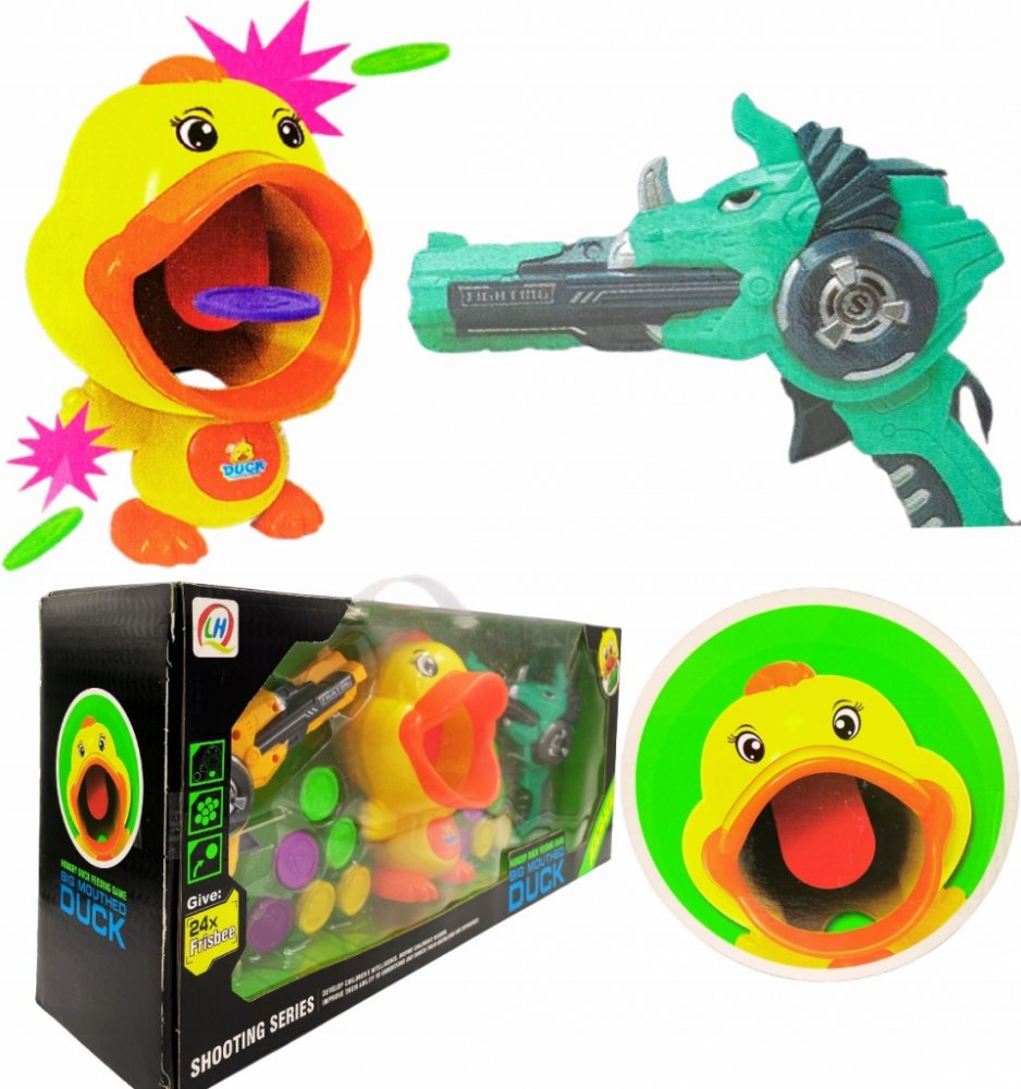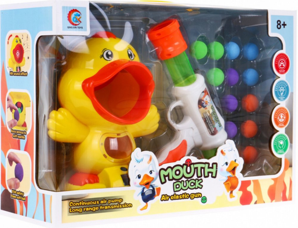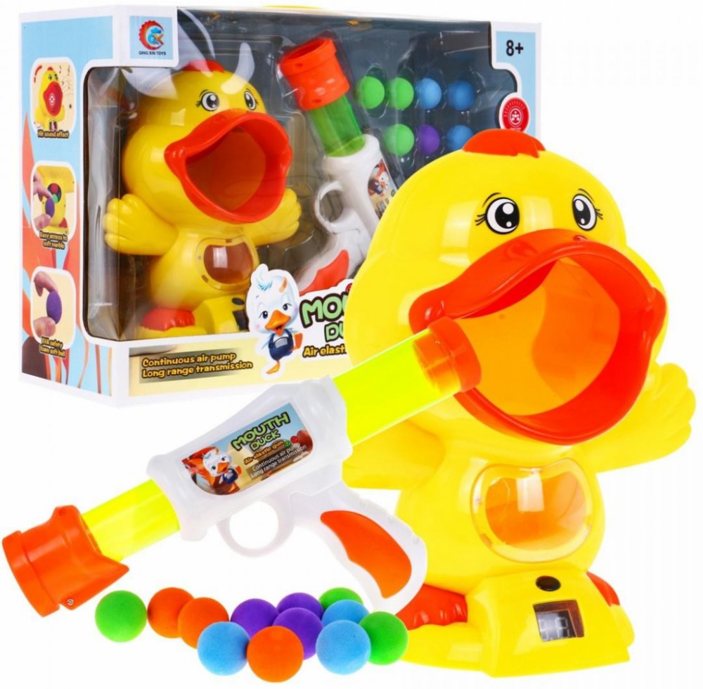 PopisSada pistole + kachna Úžasná sada pistole s měkkými míčky a kachnou jako terčem je určena pro děti od 8 let. Pistole nevyžaduje baterie, je poháněna vzduchem, stačí umístit kuličky do hlavně, napnout pružinu tahem hlavně dopředu a pak dozadu. Kuličky jsou lehké a měkké, a proto bezpečné. Pokud se vám podaří zasáhnout kachní jazyk, hračka vydá charakteristický zvuk. LCD displej počítá zasažené cíle. Kachna je napájena 3 bateriemi AAA 1,5 V. Dítě se hrou učí soustředit na cíl, procvičuje si koncentraci a koordinaci ruka-oko.Rozměry - pistole cca 39,5 cm x 15 cm x 5,5 cm,- kachna cca 23 cm x 20 cm x 13 cm,- míč o průměru cca 3 cm.- obal cca 42,5 cm x 30 cm x 15,5 cm.Obsah sady - kuličková pistole,- terč v podobě kachny,- 12 x pěnové míčky.