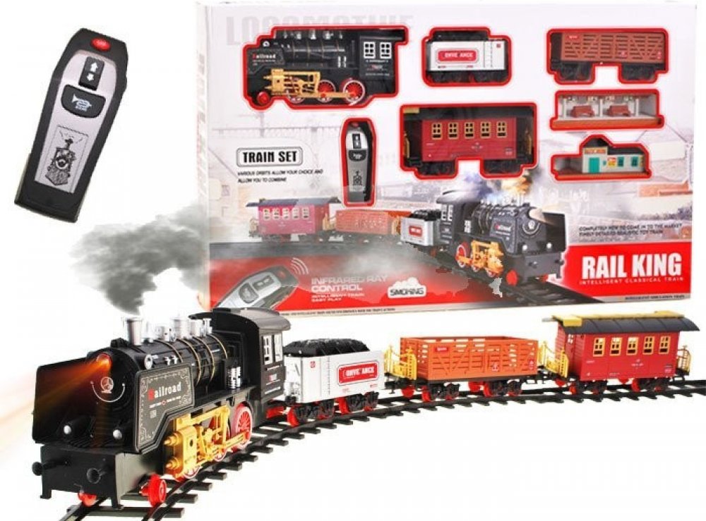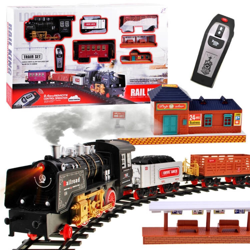 Užijte si klasickou železniční zábavu s realistickou parní lokomotivou na dálkové ovládání. Vláček nabízí světelné efekty, kouř z komína, autentické zvuky a plynulé zrychlování a zpomalování. Velký oválný okruh s příslušenstvím promění každý pokoj v malé nádraží.
