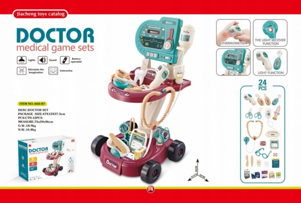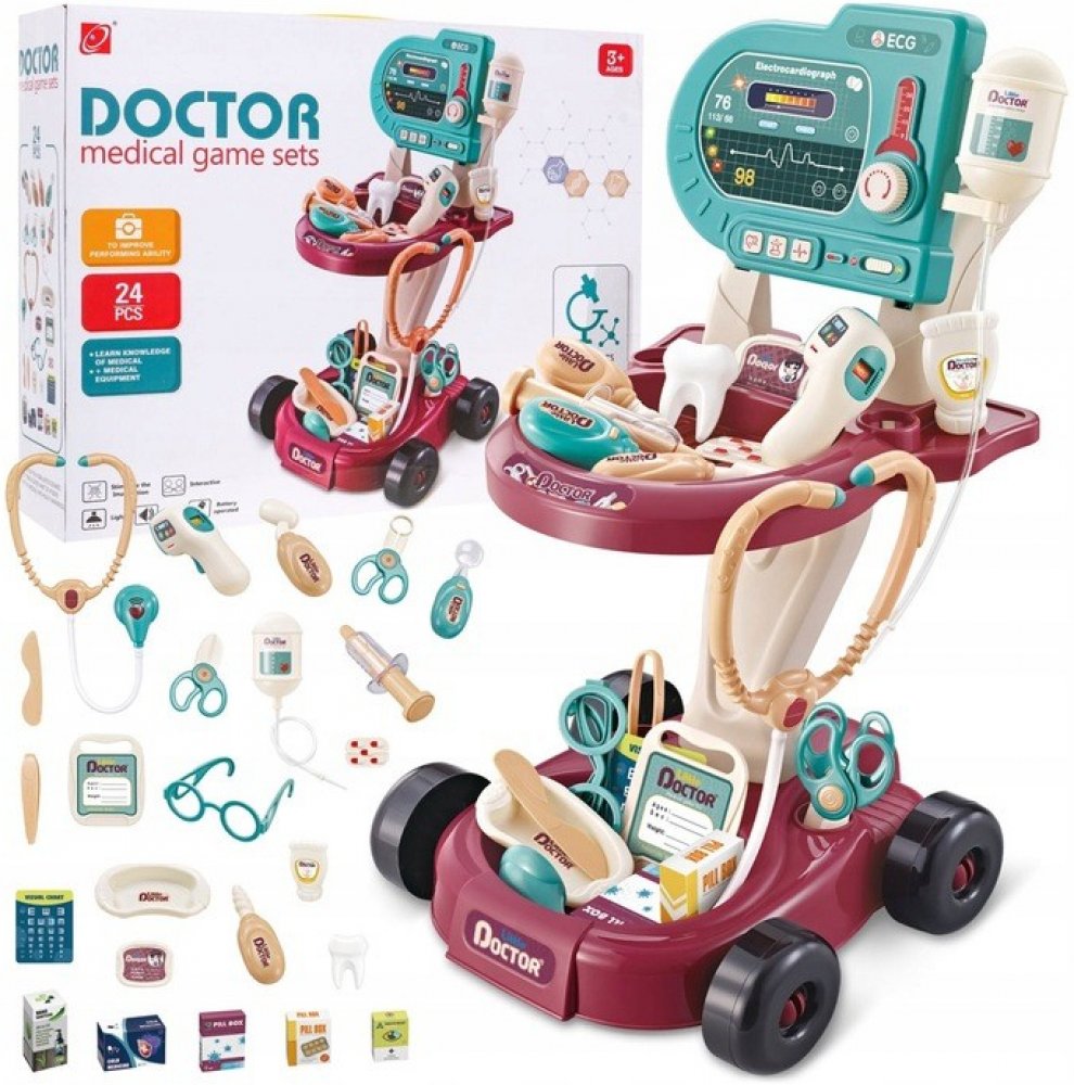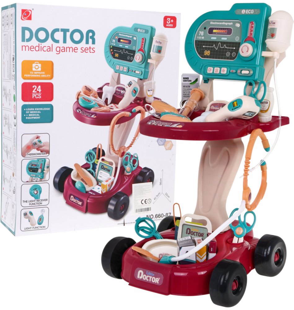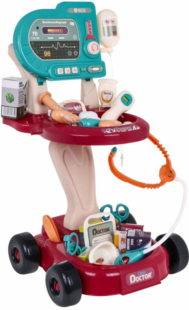PopisMalý doktorský kočárek Bezpečná, barevná interaktivní sada se zvukovými a světelnými efekty pro děti od 3 let.Hračka je konstruována jako praktický vozík na kolečkách, který lze rychle kamkoli přemístit. Sada obsahuje 24 doplňků potřebných ke hře na malého doktora. EKG panel má světelnou (blikající červená LED dioda) a zvukovou funkci (zvuk měření, alarm, srdeční tep) a je napájen 2 x AA 1,5V bateriemi (nejsou součástí balení). Stetoskop a teploměr mají také světelný a zvukový efekt. Stetoskop vydává zvuk tlukotu srdce a signalizuje ho červenou LED diodou. Teploměr vydává zvuk měření a zároveň svítí červená LED dioda. Diagnostické zrcátko má podsvícení. Rozměry- vozík cca 56 cm x 42,5 cm x 32 cm,- obal cca 47 cm x 37,5 cm x 12 cm.Obsah soupravy -- vozík na příslušenství s policemi,- EKG panel s diodou srdečního tepu, zvukem měření a alarmem,- stetoskop se zvukem srdečního tepu a červenou blikající diodou,- diagnostické zrcátko s osvětlením,- odkapávací miska,- ochranné brýle,- injekční stříkačka,- lékařská ledvinka,- lékařská vrtačka,- trsátko na zuby,- teploměr se světlem a zvukem,- tubu se sterilizační tekutinou na ruce,- karton s dezinfekčním prostředkem na ruce,- nůžky,- držák na kosti,- neurologické kladívko,- identifikátor,- kartu pacienta,- pinzetu,- nůž,- blistr s léky,- oční karta,- oční kapky,- krabička s léky,- antivirotika,- krabička na tablety,- barevné ozdobné samolepky..