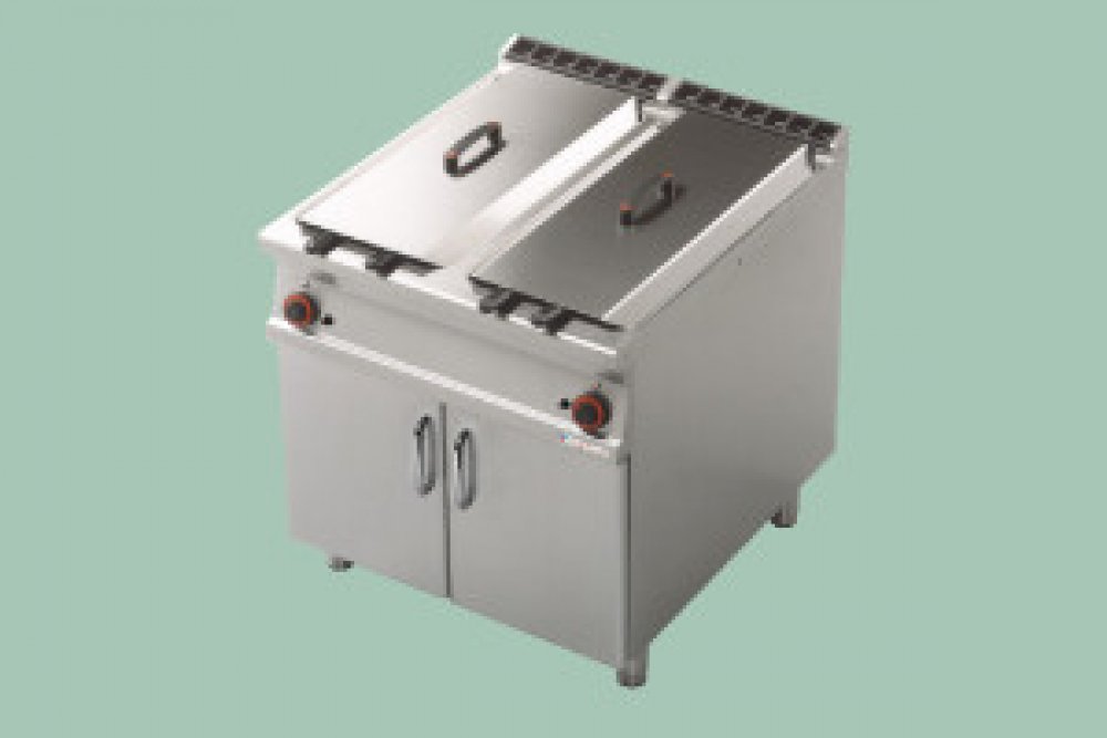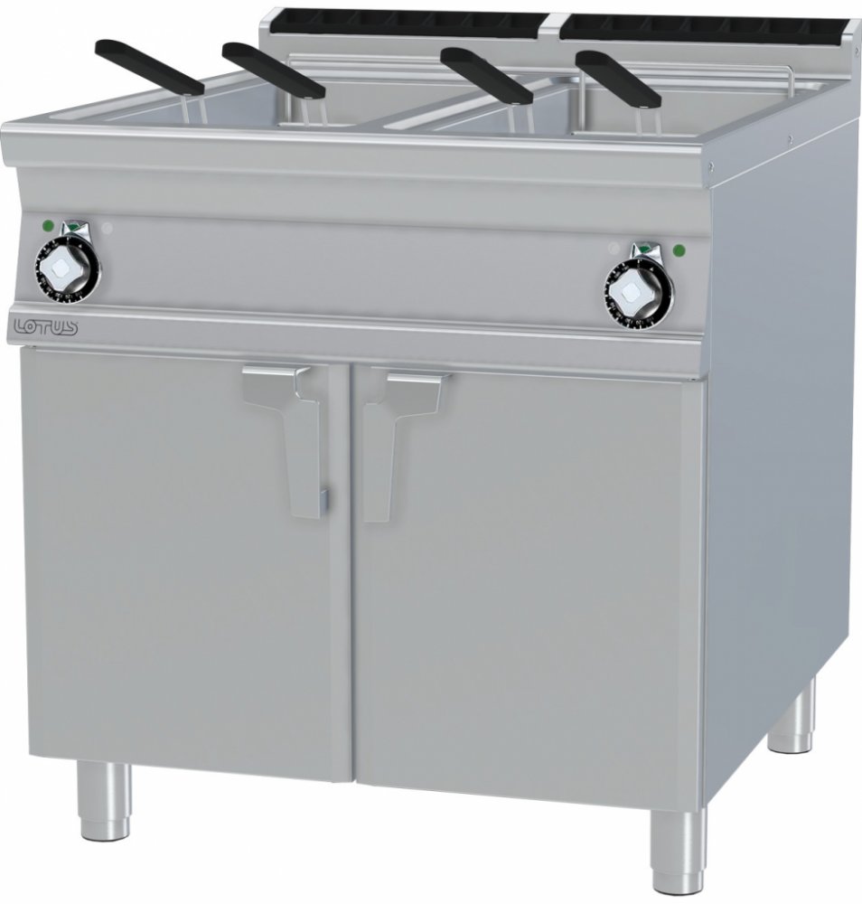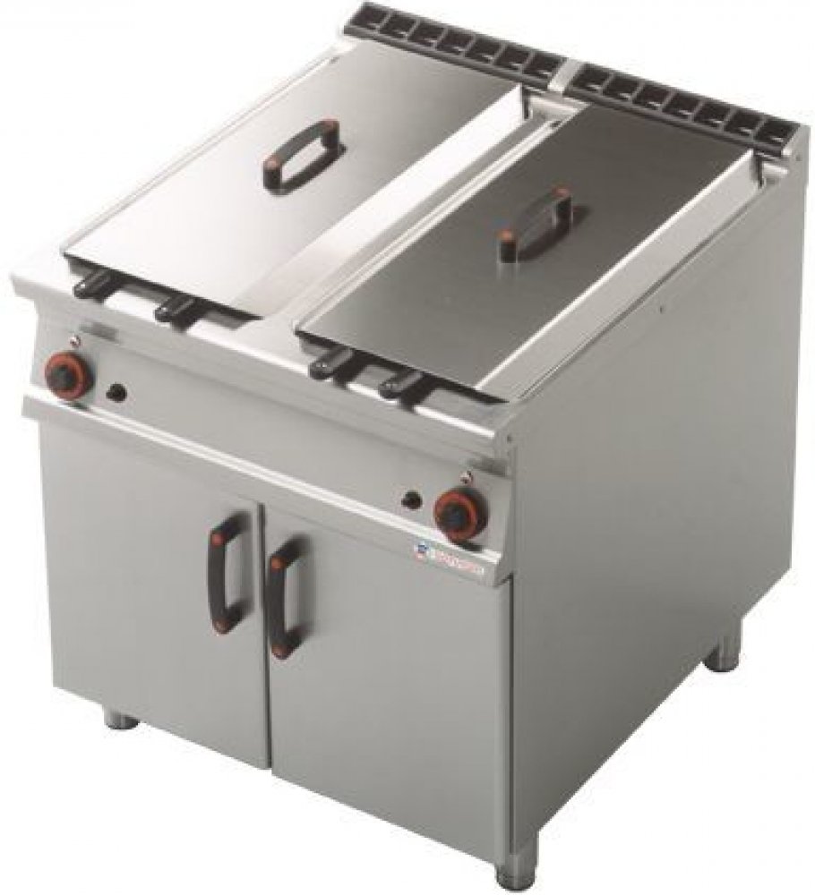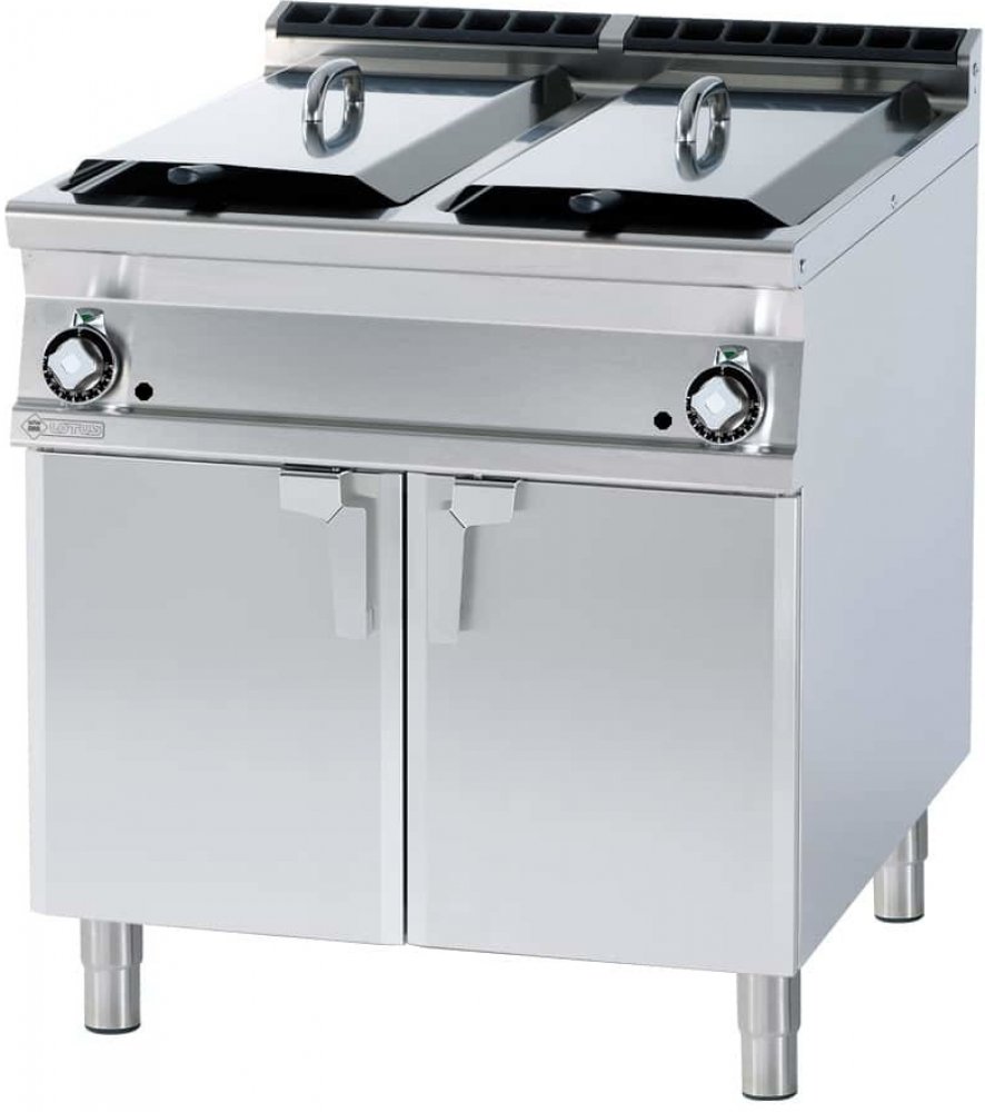 Fritéza dvojitá plynová 2x25 l vyrobená z nerezové oceli, třífázová. 2X vana, rozměr vany v cm: 31x51x44, 4x koš, rozměr koše v cm: 13,5x45x15, s víkem. Produkce 50 kg/hod. Vhodná do kuchyně nad 500 jídel – nemocnice, školy, věznice, ústavy apod. Masivní konstrukce z plechu o síle 2 mm. Důsledné zaoblení hran pro snadnou údržbu. Nová konstrukce hořáku pro maximální účinnost. Maximálně pevné a odolné spojení modulů. Nový systém smaltování pro vyšší odolnost a životnost hořáků.