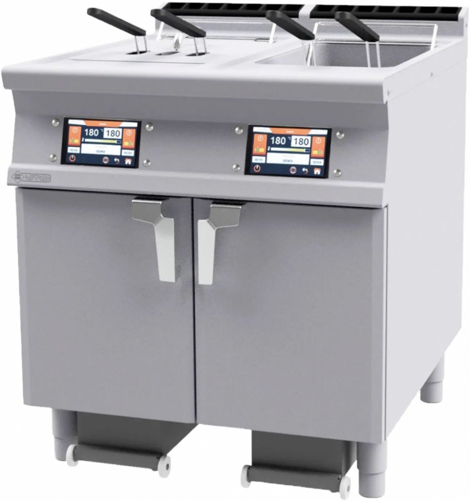 Fritéza el. 25+25 l automatická F2/25-98ETDP RM GASTRO má 7" displej a filtraci horkého oleje. Možnost uložení až 100 programů do paměti. Vybavena sběrnou nádobou na olej s kolečky s 5 mikronovým sítem. Fritéza F2/25-98ETDP se senzorem přítomnosti oleje a maximální hladiny. Vhodná do gastronomického provozu s denním výdejem nad 300 porcí.