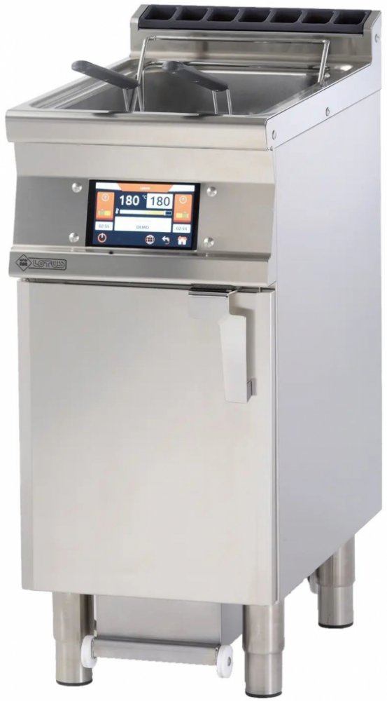 Fritéza elektrická F25 94ETD v nerezovém provedení s podestavbou o objemu 25 l, automatická, s 7" displejem má prolisovanou vrchní desku pro komfortní údržbu a čištění, kontrolky chodu a nahřátí, výpusť do podestavby. Zařízení je vybaveno bezpečnostním termostatem, nastavitelnými nožičkami, koše 2×, vana 1×. Rozměr košů 135x450x150 mm.