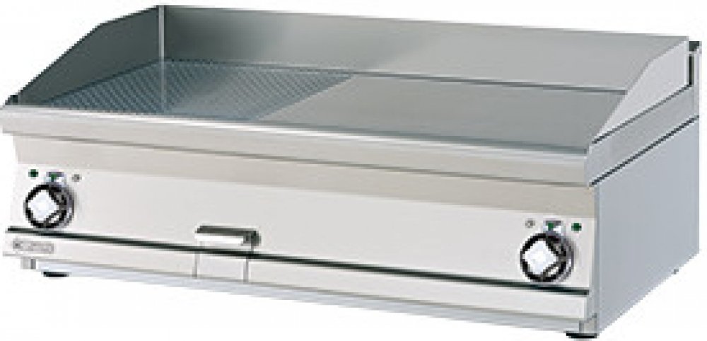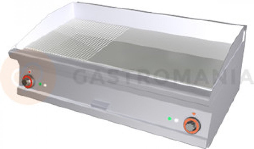 Grilovací deska kombinovaná FTLRT 610 ET, RM Gastro , která je vhodná do kuchyní s produkcí do 100 jídel (malé restaurace,bufety,..). Vlastní zásuvku na odpadní tekutiny a 2 samostatné ovládání. Zařízení RM Gastro s vrchní pracovní deskou o síle 2,5 mm a grilovací deskou o síle 14 mm.