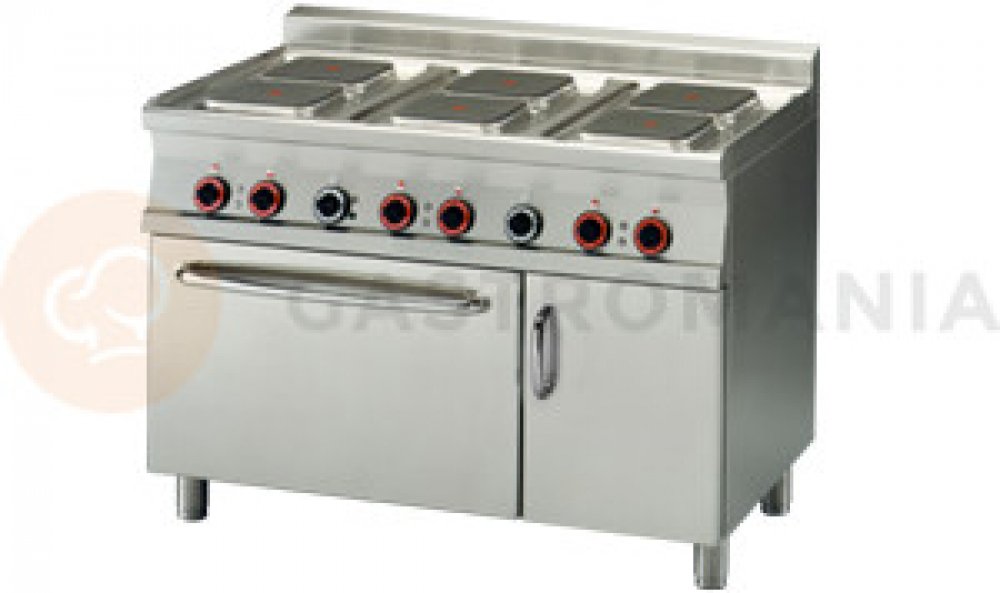 Sporák elektrický s 6 plotýnkami a el.troubou GN 2/1 vyrobený z nerezové oceli, třífázový. Příkon plotýnek : 6x2,6 kW, rozměr 22x22 cm. Příkon trouby 5,0 kW, rozměr trouby v cm: 68x55x34 v, 1x skříňka s dvířky. Vhodný do kuchyně do 300 jídel – hotely, školy a restaurace. Pevná kovová konstrukce s tloušťkou 1,5 mm a masivní rošty z nerezové oceli. Důsledné zaoblení hran pro snadnou údržbu. Hořáky s vnějším a vnitřním hořením, lisované nerezové trouby. Maximální velikost trouby 3x GN 1/1. Tálová vařidla o šířce 80 a 120 cm – tál je kombinovaný s klasickými hořáky.