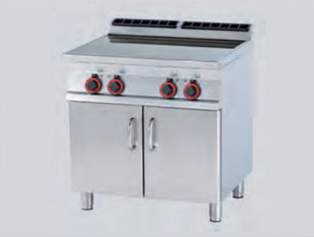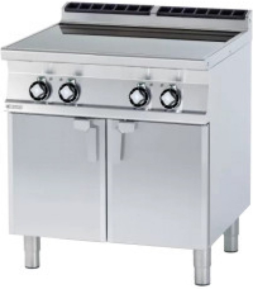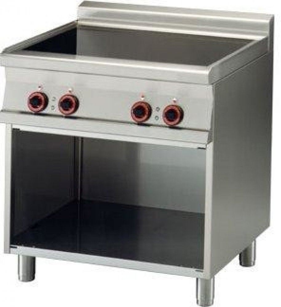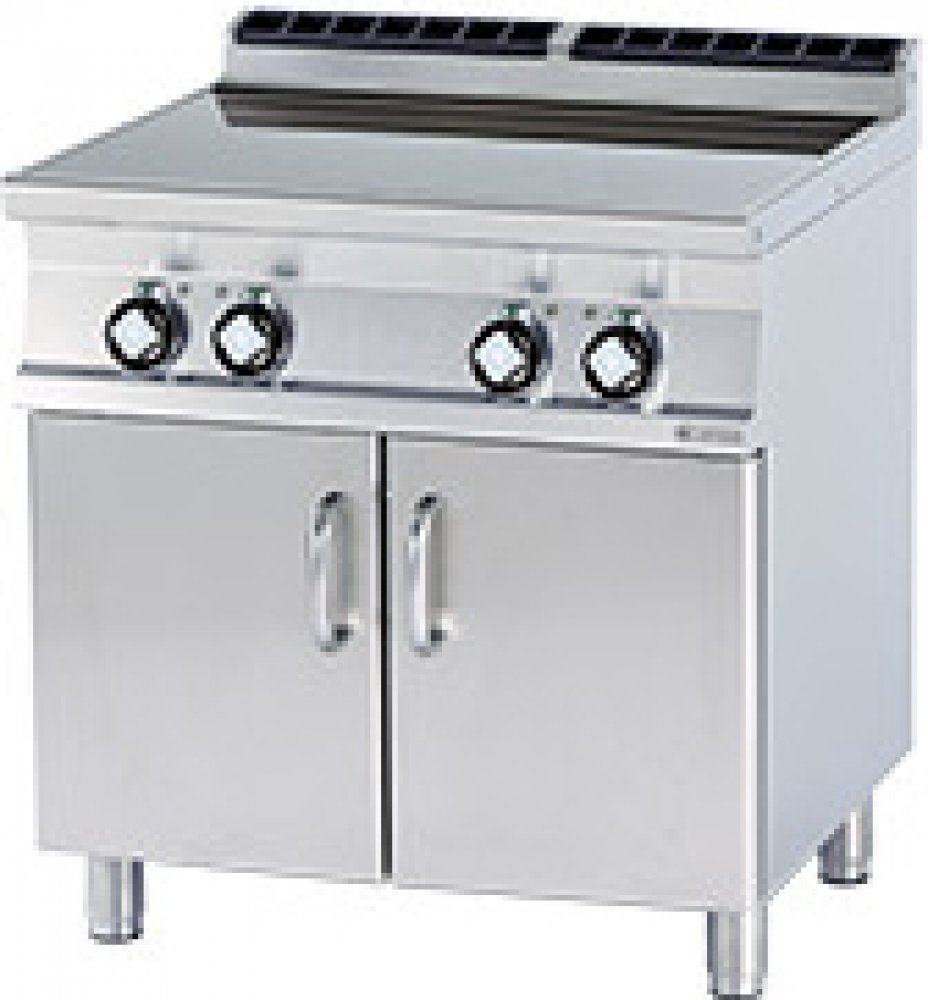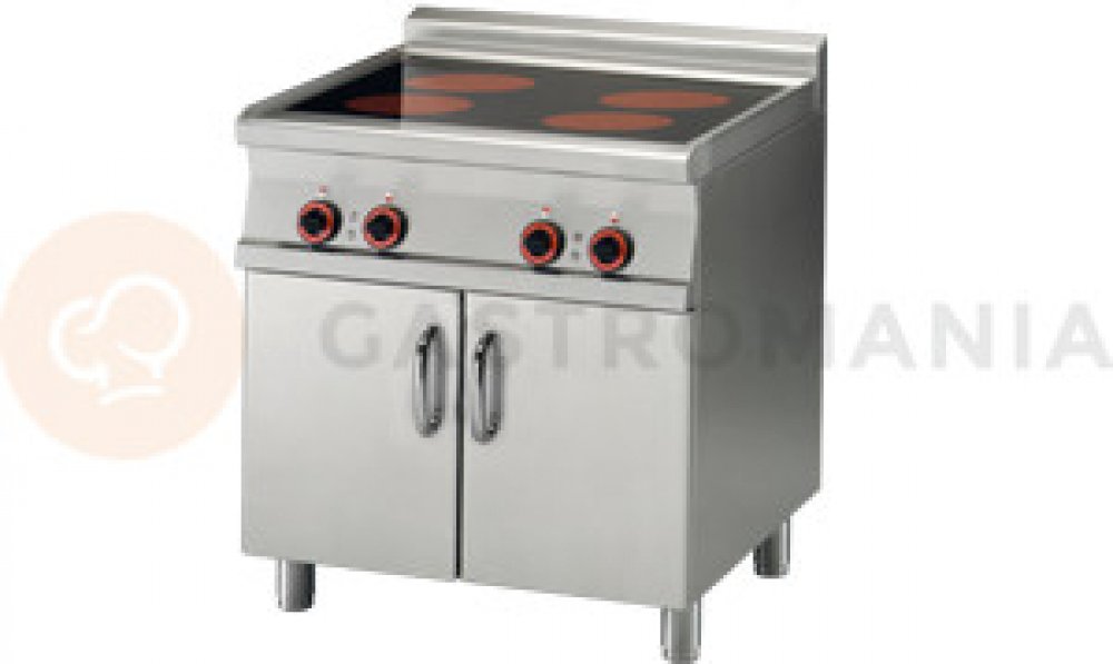 Sporák sklokeramický elektrický se skříňkou, 4 varnými plochy vyrobený z nerezové oceli, třífázový, 4x varná plocha 2,5 kW. Deska o rozměru: 75 x 57 cm. Vhodný do kuchyně do 300 jídel – hotely, školy a restaurace. Pevná kovová konstrukce s tloušťkou 1,5 mm a masivní rošty z nerezové oceli. Důsledné zaoblení hran pro snadnou údržbu. Hořáky s vnějším a vnitřním hořením, lisované nerezové trouby. Maximální velikost trouby 3x GN 1/1. Tálová vařidla o šířce 80 a 120 cm – tál je kombinovaný s klasickými hořáky.