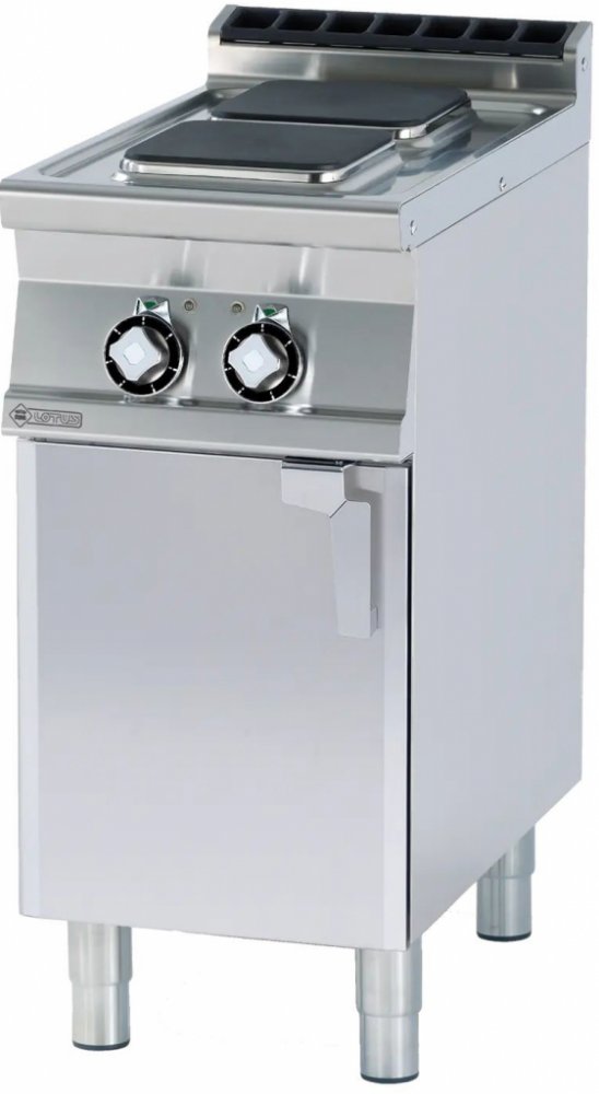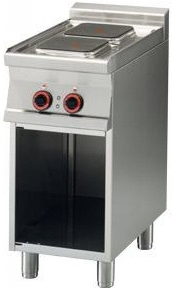 Sporák elektrický se skříňkou PCQ 74 ET - 2 zóny, RM Gastro vhodný do kuchyní s produkcí do 300 jídel (restaurace, bufety). Možnost instalace všech modelů i do L nebo U profilů. Třífázový sporák RM Gastro vlastní 2 čtvercové plotny se 7 teplotními stupni a termostatickou ochranou proti přehřátí.