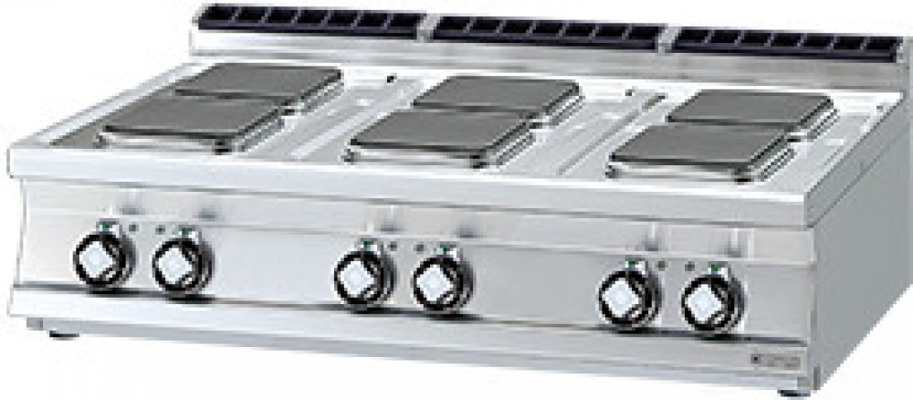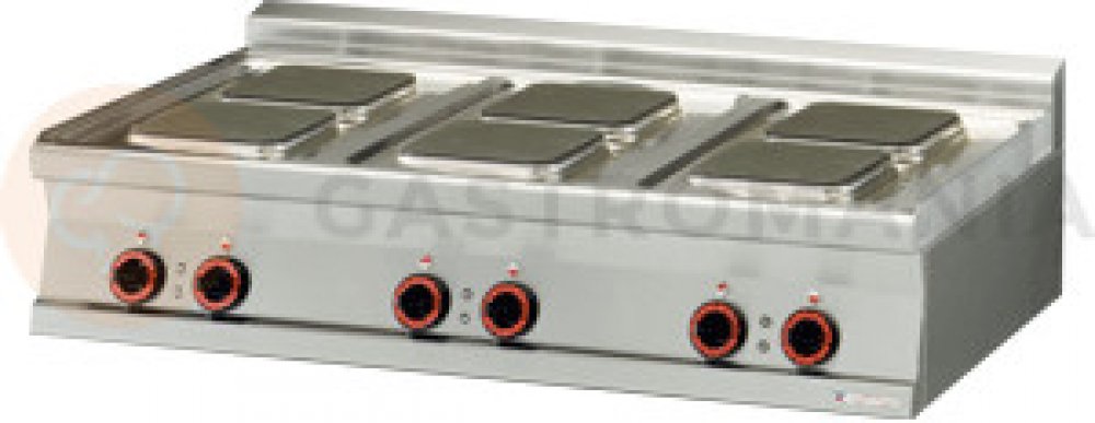 Sporák elektrický PCQT 712 ET - 6 zón, RM Gastro s termostatnickou ochranou proti přehřátí je vhodný do kuchyní s produkcí do 300 jídel (restaurace, bufety). Možnost instalace všech modelů i do L nebo U profilů. Sporák RM Gastro vlastní 6 čtvercových ploten o rozměru 220 x 220 mm a 7 teplotních stupňů.